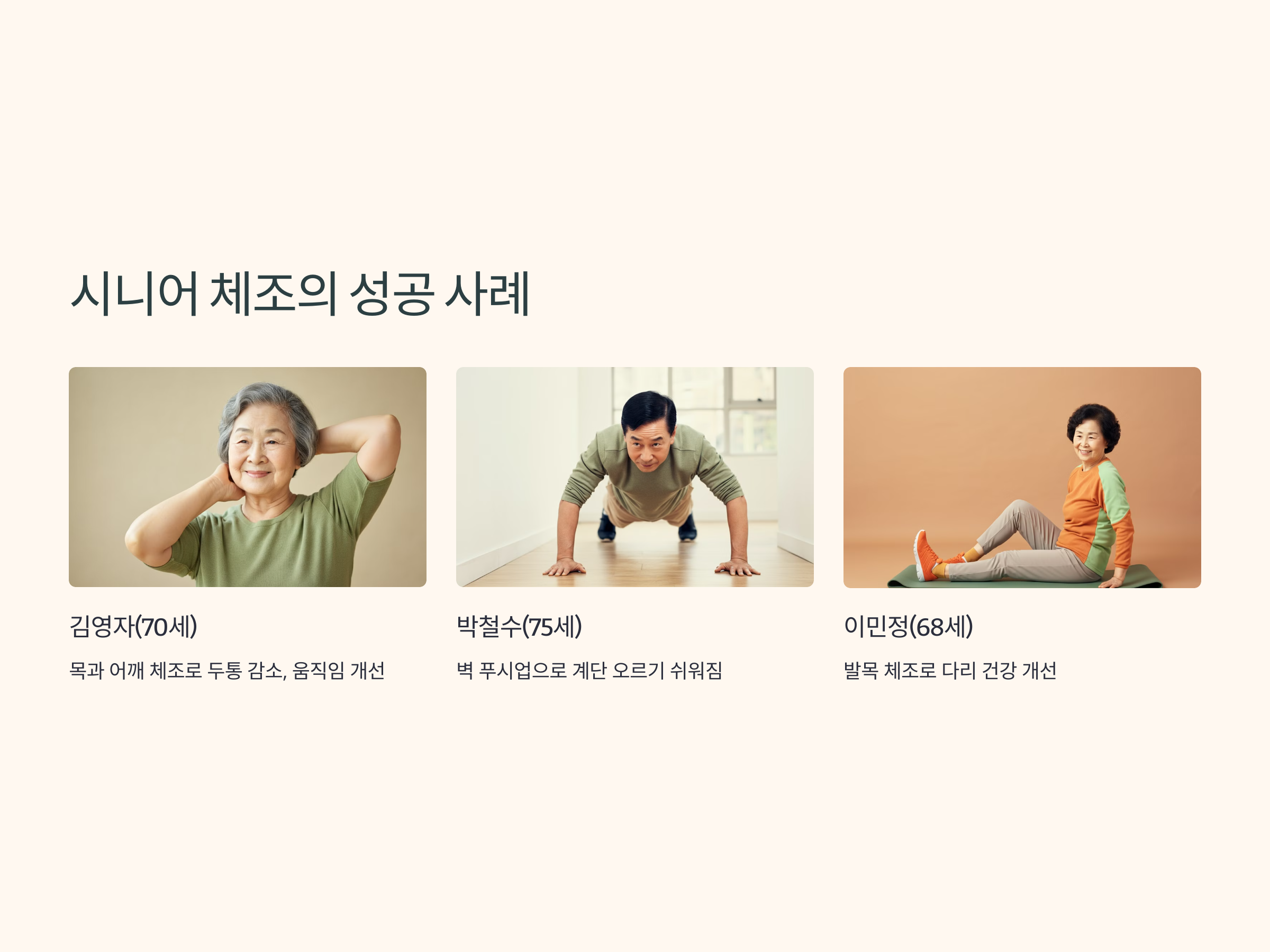 많은 시니어들이 체조를 통해 삶의 질을 높이고 있습니다. 아래는 성공 사례입니다.