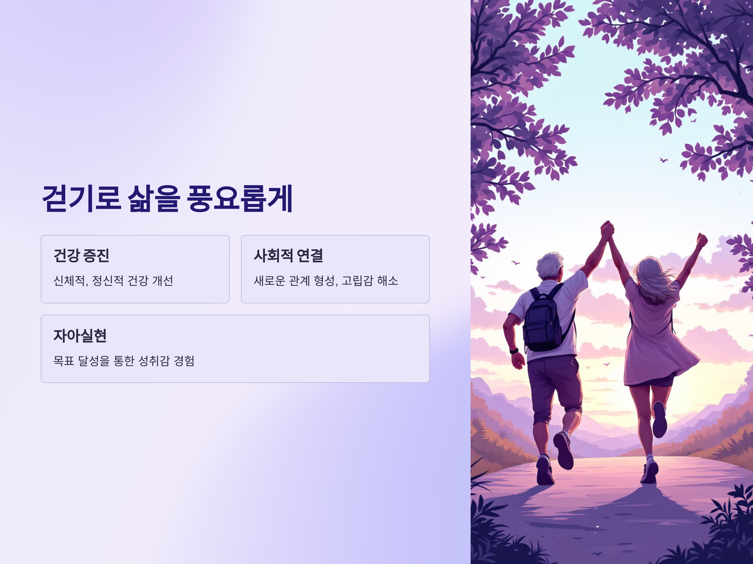 걷기는 심장 건강과 근력을 강화하고 관절을 부드럽게 유지하는 데 탁월합니다. 시니어 걷기 대회는 단순한 운동을 넘어 규칙적인 걷기를 생활화하는 데 동기를 부여합니다. 더불어 자연 속에서의 걷기는 스트레스를 해소하고 정신 건강에도 긍정적인 영향을 미칩니다.