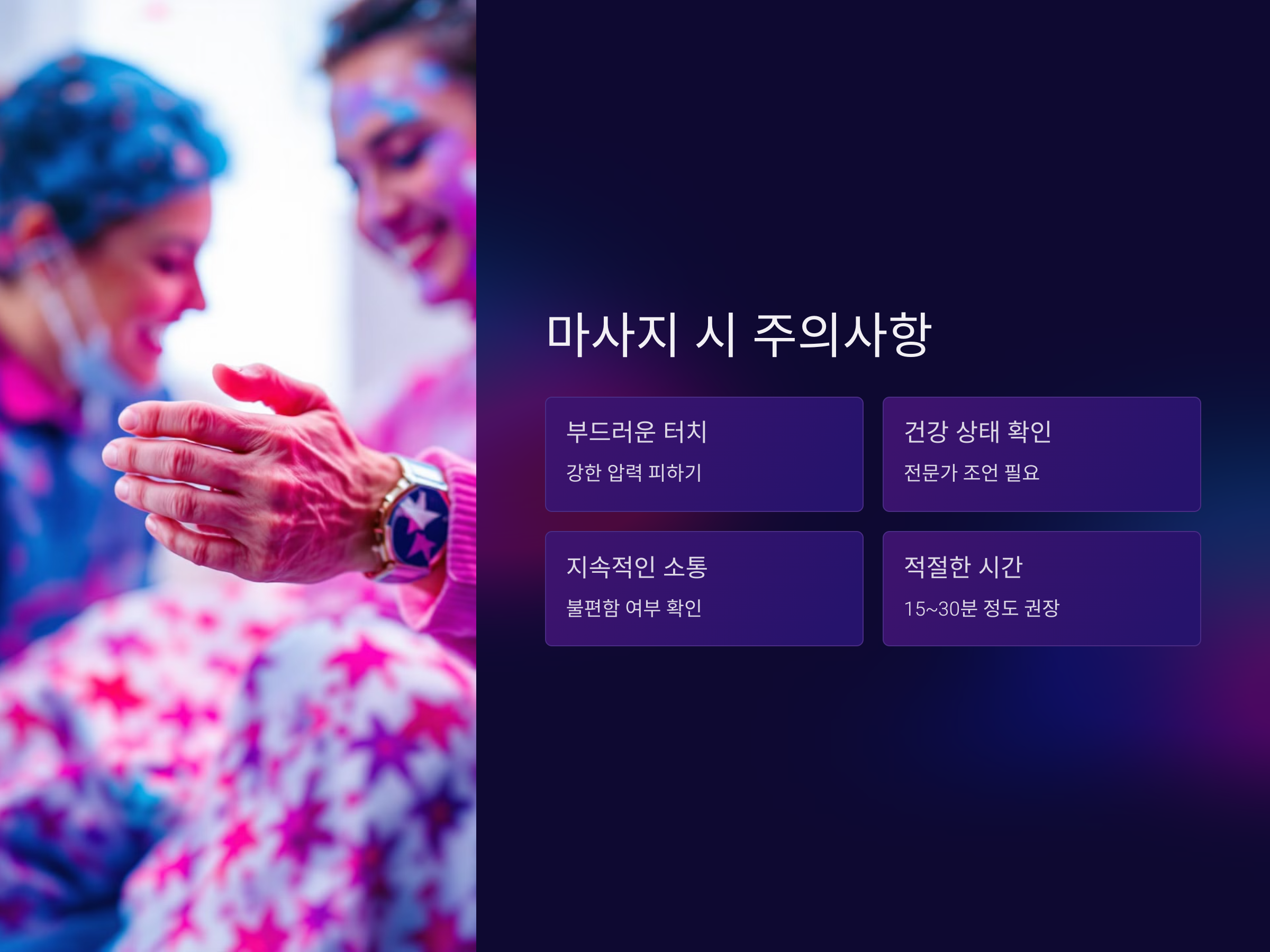 - 부드러운 터치: 시니어의 피부와 근육은 약하기 때문에 강한 압력은 피해야 합니다.