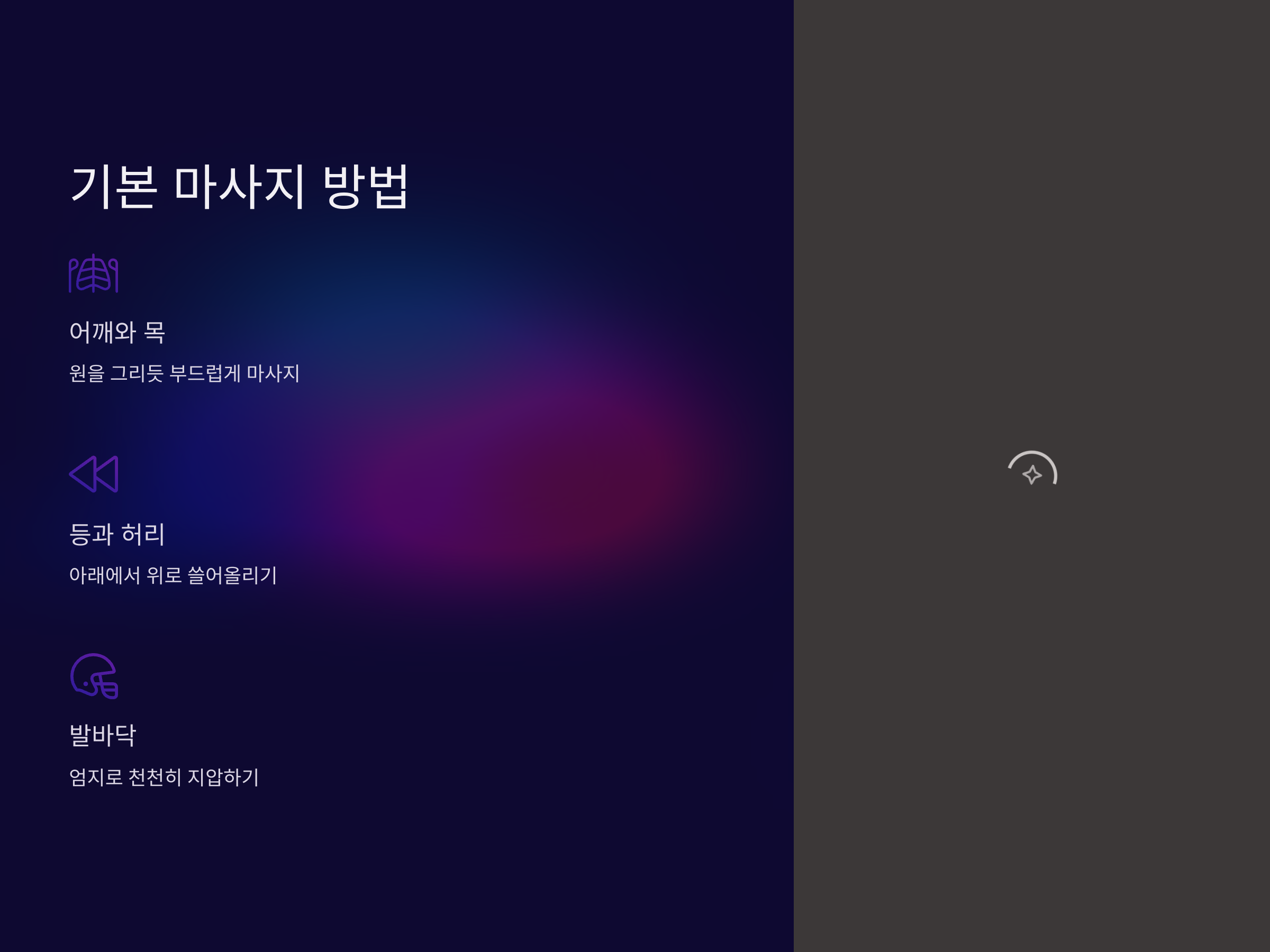 - 스트레스 완화: 마사지를 통해 긴장을 풀고 심리적 안정을 유도합니다.