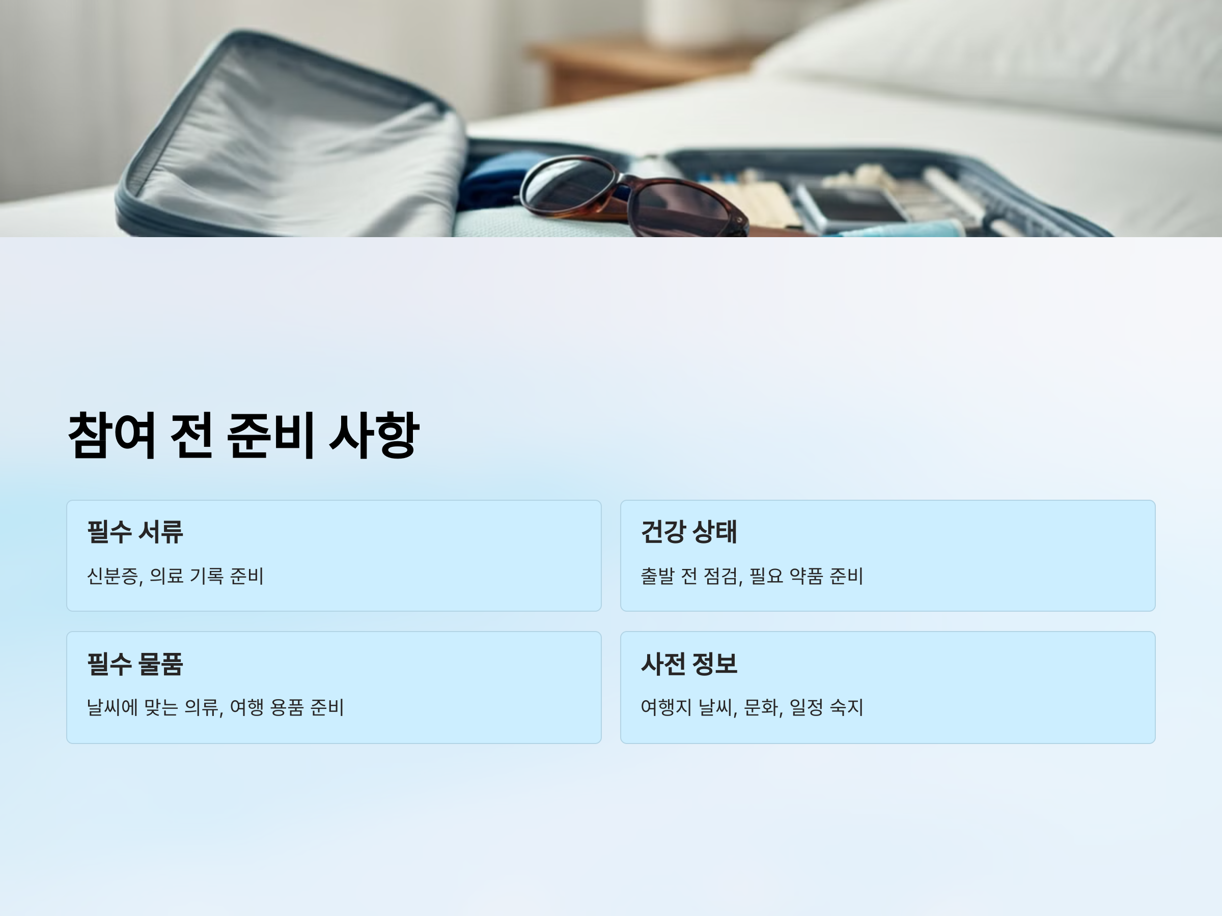 - 사전 정보 확인: 여행지의 날씨, 문화, 일정 등을 미리 숙지하세요.