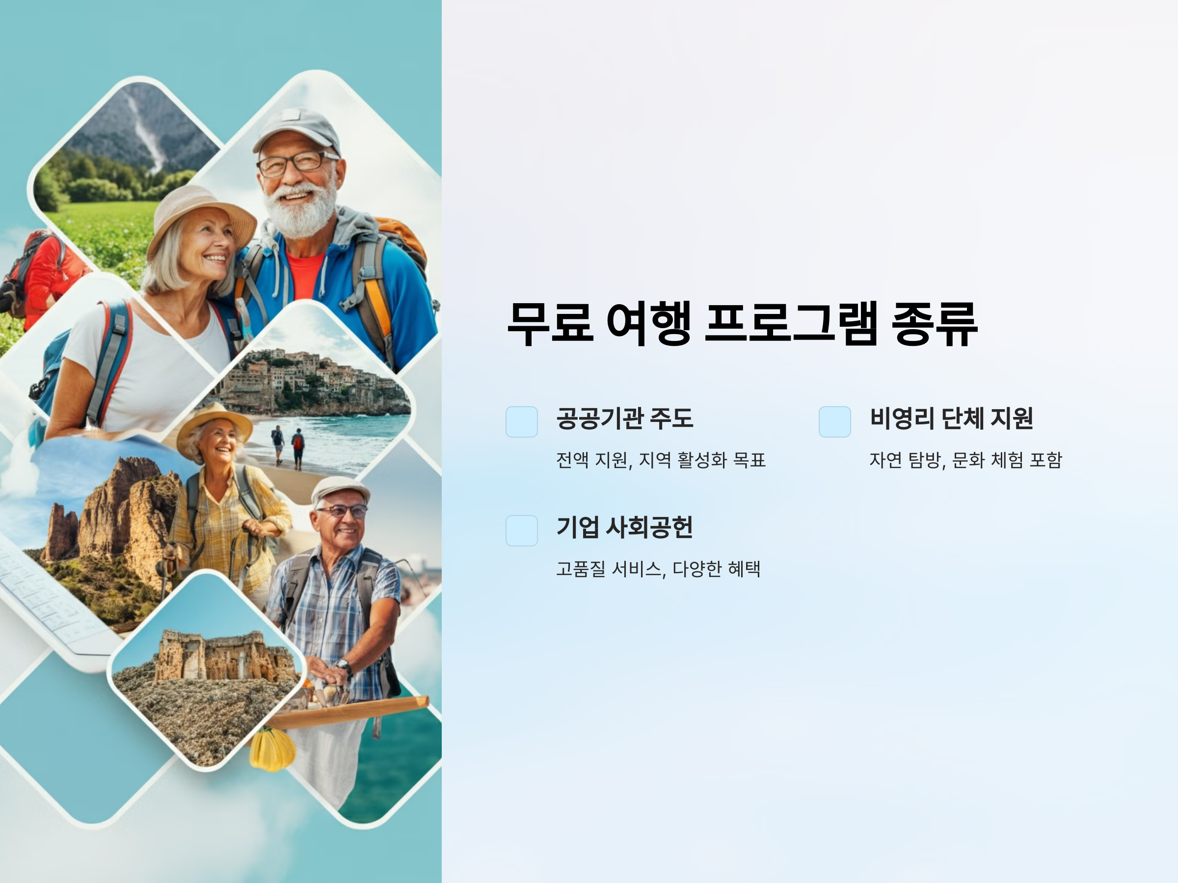 - 공공기관 주도 프로그램: 정부 및 지자체에서 제공하는 여행 프로그램은 교통비와 숙박비를 포함한 전액 지원 혜택을 제공합니다. 주로 지역 활성화와 노인 복지를 목표로 운영됩니다.