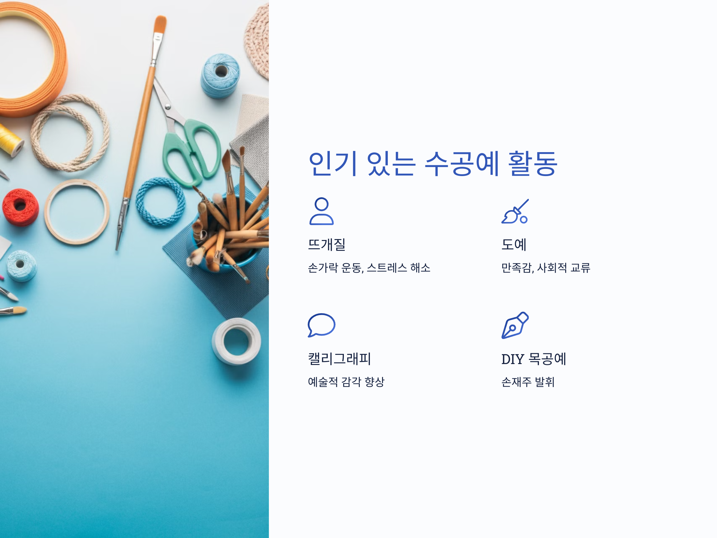 이처럼 수공예 활동은 단순한 여가를 넘어 삶의 질을 높이는 도구가 됩니다.
