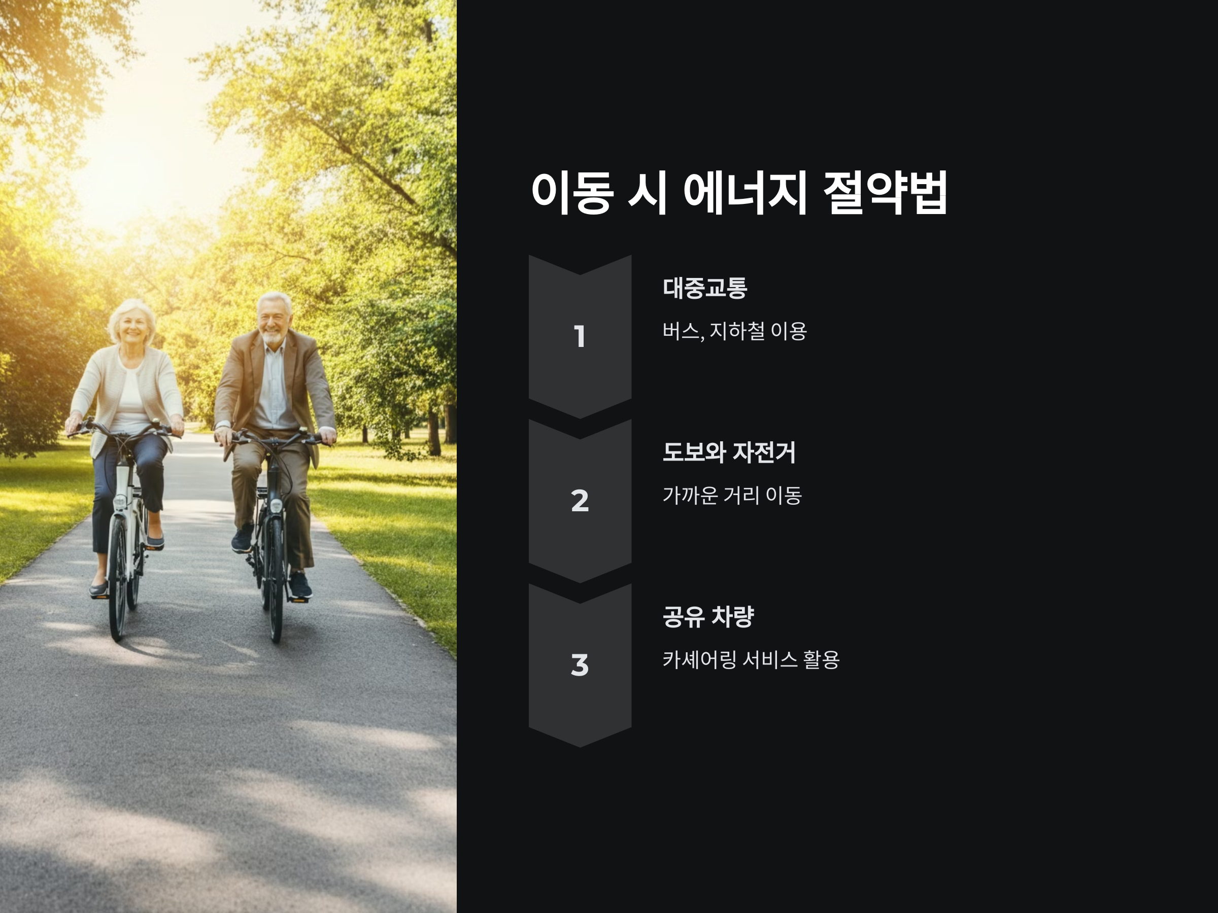 - 도보와 자전거: 가까운 거리는 걷거나 자전거를 이용하세요. 건강도 챙기고 에너지도 절약할 수 있습니다.