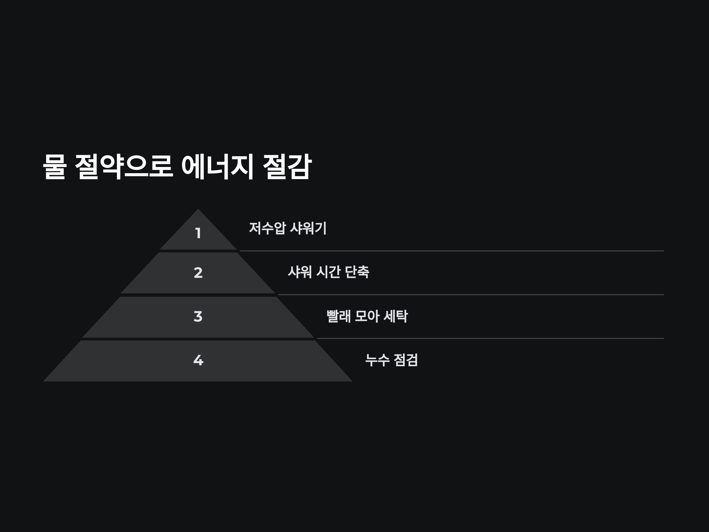 - 저수압 샤워기 사용: 물 소비를 줄이면서도 동일한 샤워 경험을 제공합니다.