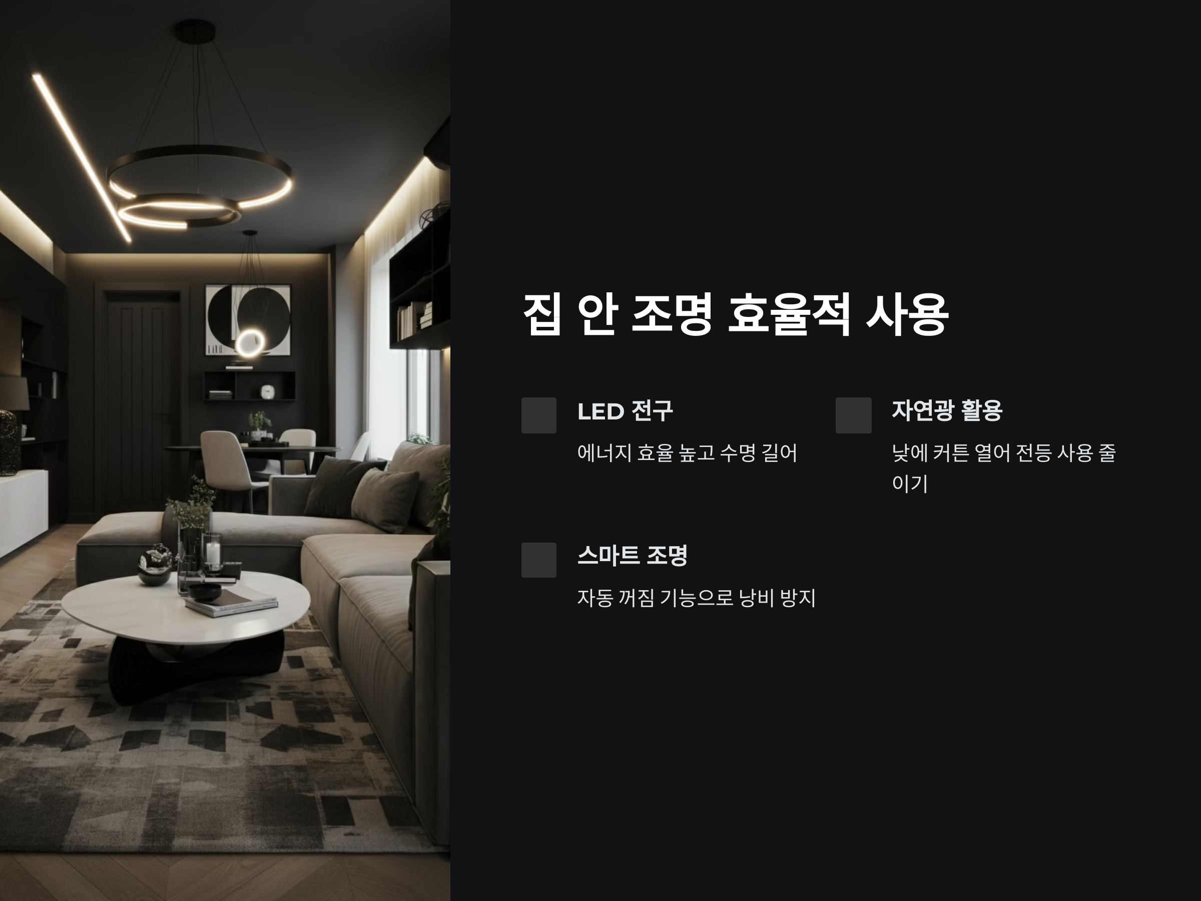 - 조명 구역 설정: 주로 사용하는 공간만 밝게 하고, 사용하지 않는 방의 조명은 꺼두는 습관을 들이세요.