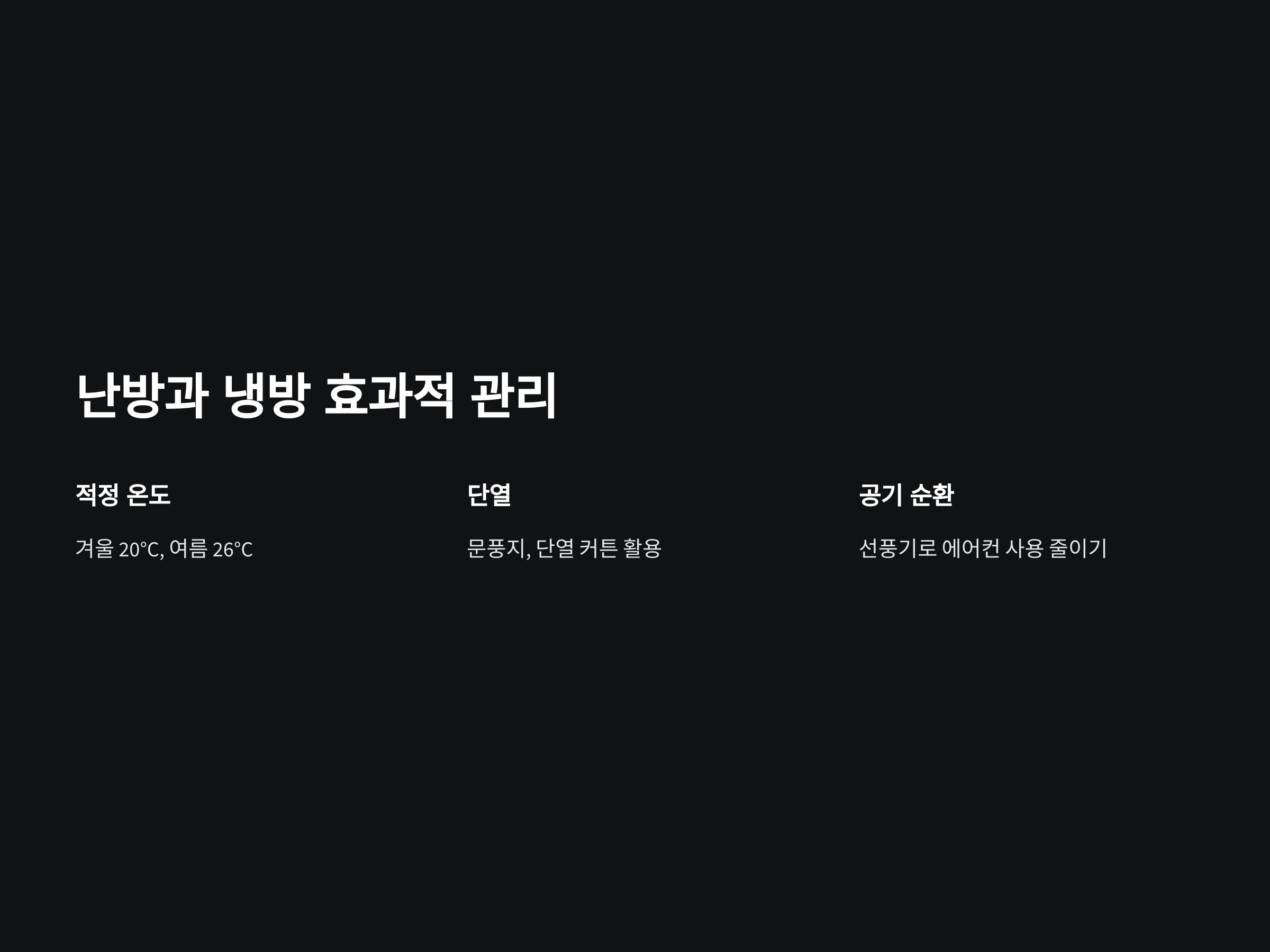 - 적정 온도 유지: 겨울에는 20°C, 여름에는 26°C로 설정하는 것이 가장 효율적입니다.
