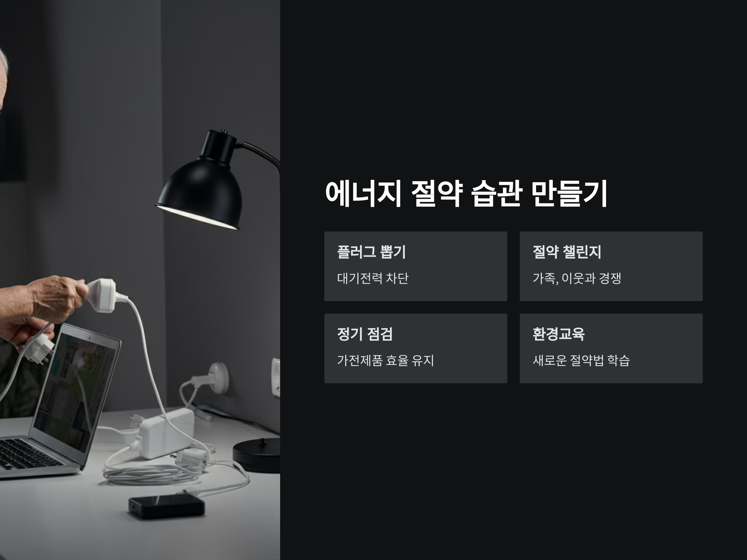 - 플러그 뽑기 습관: 사용하지 않는 기기의 플러그를 뽑으면 대기전력을 완전히 차단할 수 있습니다.
