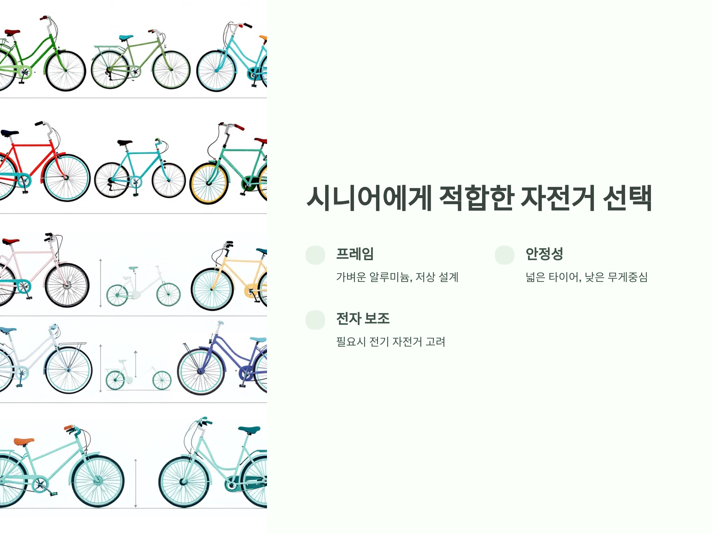 시니어에게 적합한 자전거는 안전성과 편안함을 중점적으로 고려해야 합니다. 다음은 자전거를 선택할 때 체크해야 할 주요 사항입니다: