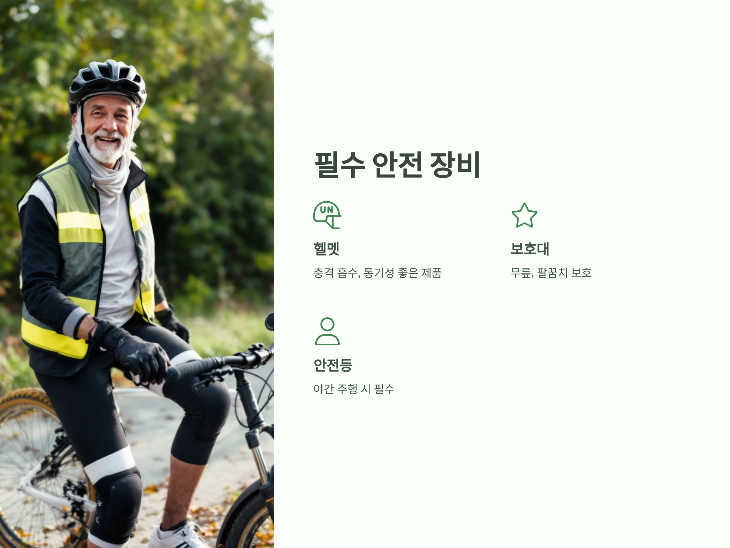 - 헬멧: 시니어 전용 헬멧은 충격 흡수가 뛰어나야 합니다. 가벼운 소재와 통기성이 좋은 제품을 추천합니다.
