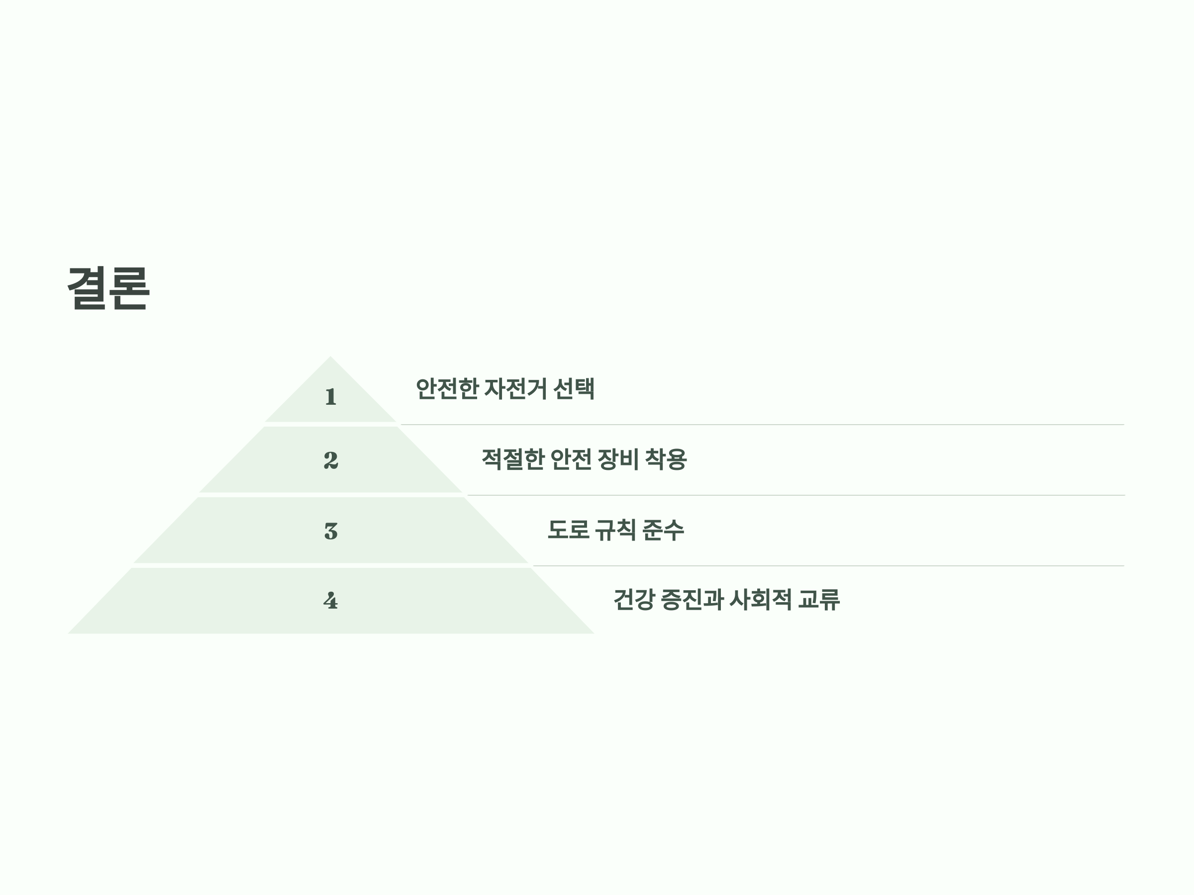 - 도로 규칙 준수: 자전거 전용 도로를 이용하고, 교차로에서는 반드시 정차합니다.