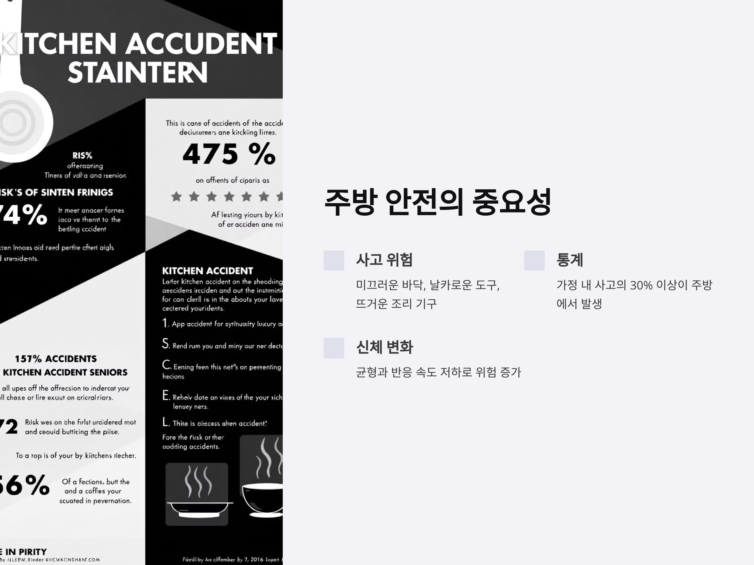 주방은 시니어들이 사고를 당하기 쉬운 공간 중 하나입니다. 미끄러운 바닥, 날카로운 도구, 뜨거운 조리 기구 등은 안전사고의 원인이 될 수 있습니다. 또한, 나이가 들면서 신체 균형과 반응 속도가 느려지기 때문에 작은 위험도 큰 사고로 이어질 가능성이 높습니다.
