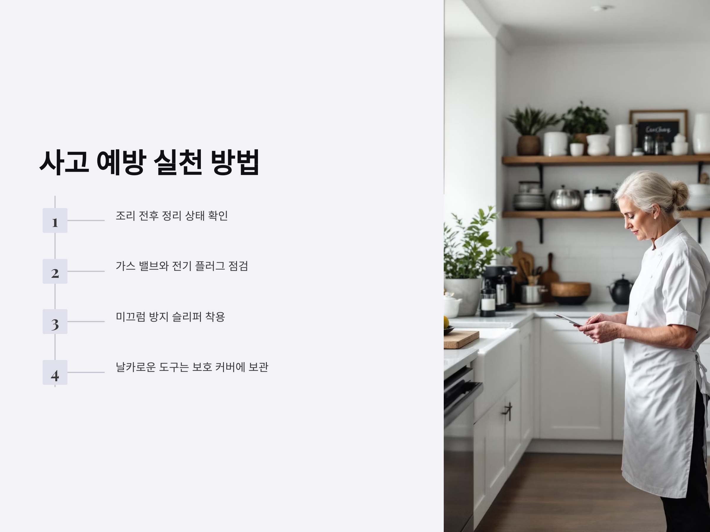 주방에서 발생할 수 있는 다양한 시나리오를 가정해 대비하는 것이 가장 효과적인 사고 예방 방법입니다.