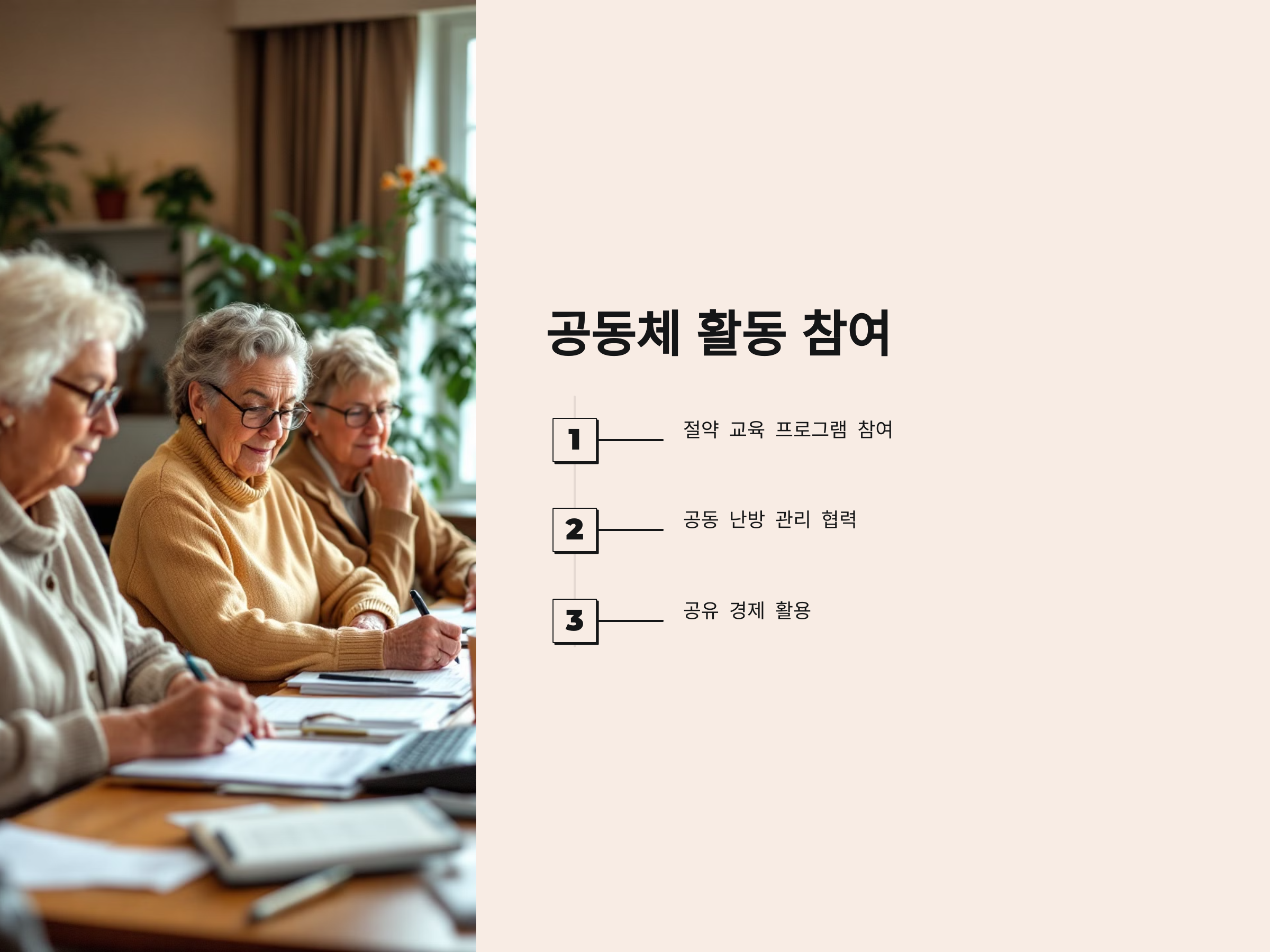 공동체 활동을 통해 시니어들이 함께 에너지 절약에 동참할 수 있습니다. 이웃 간의 협력은 단순한 비용 절감을 넘어 사회적 유대감을 강화합니다.