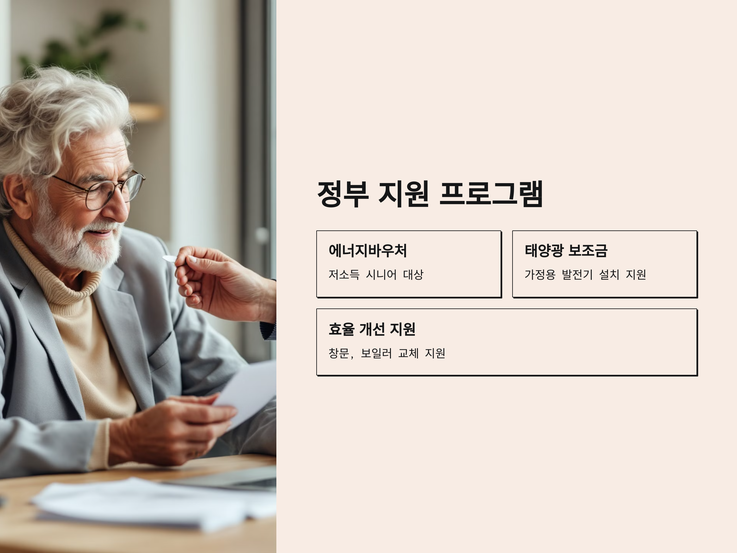 정부에서는 시니어들을 대상으로 다양한 에너지 절약 지원 프로그램을 운영하고 있습니다. 이를 적극적으로 활용하면 큰 도움을 받을 수 있습니다.