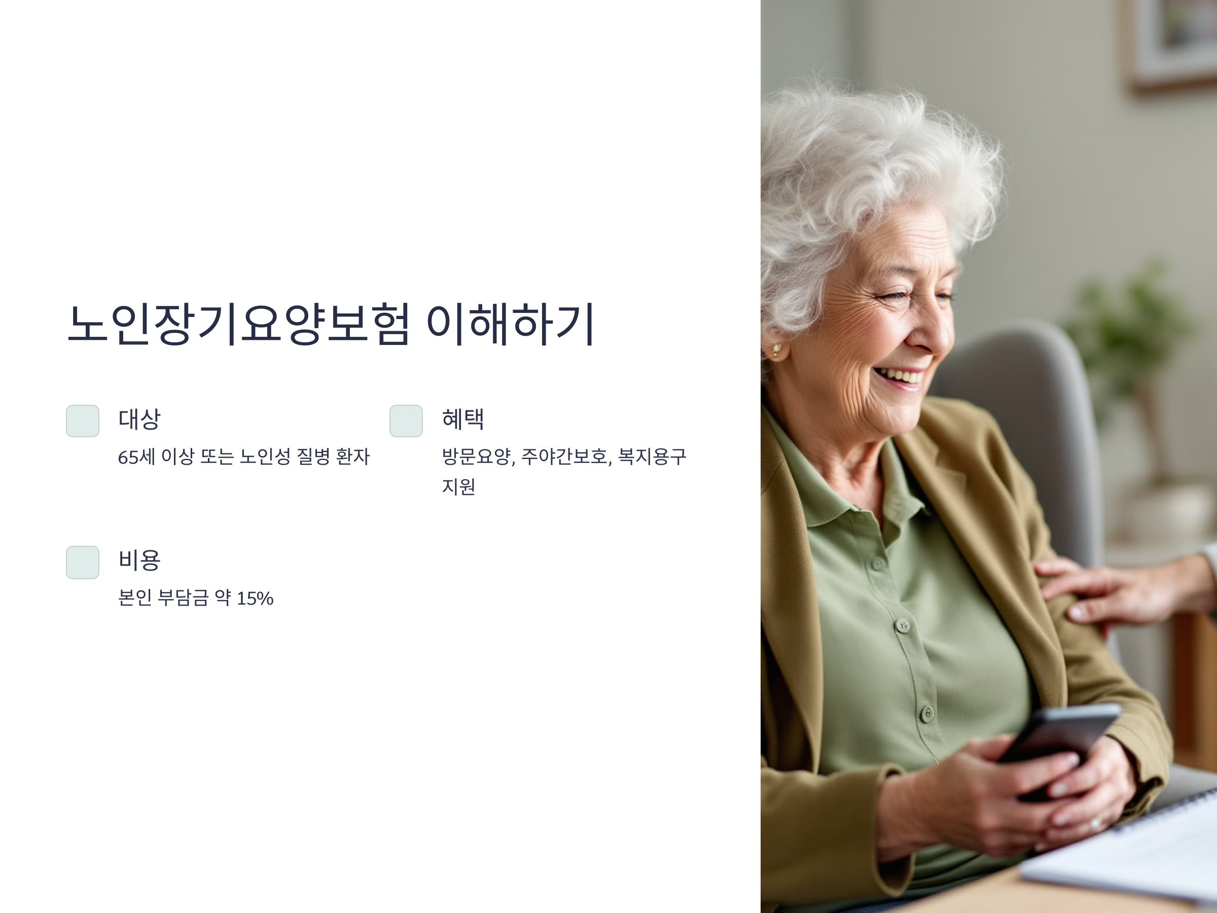 - 혜택: 방문요양, 주야간보호, 복지용구 대여 및 구입 지원
