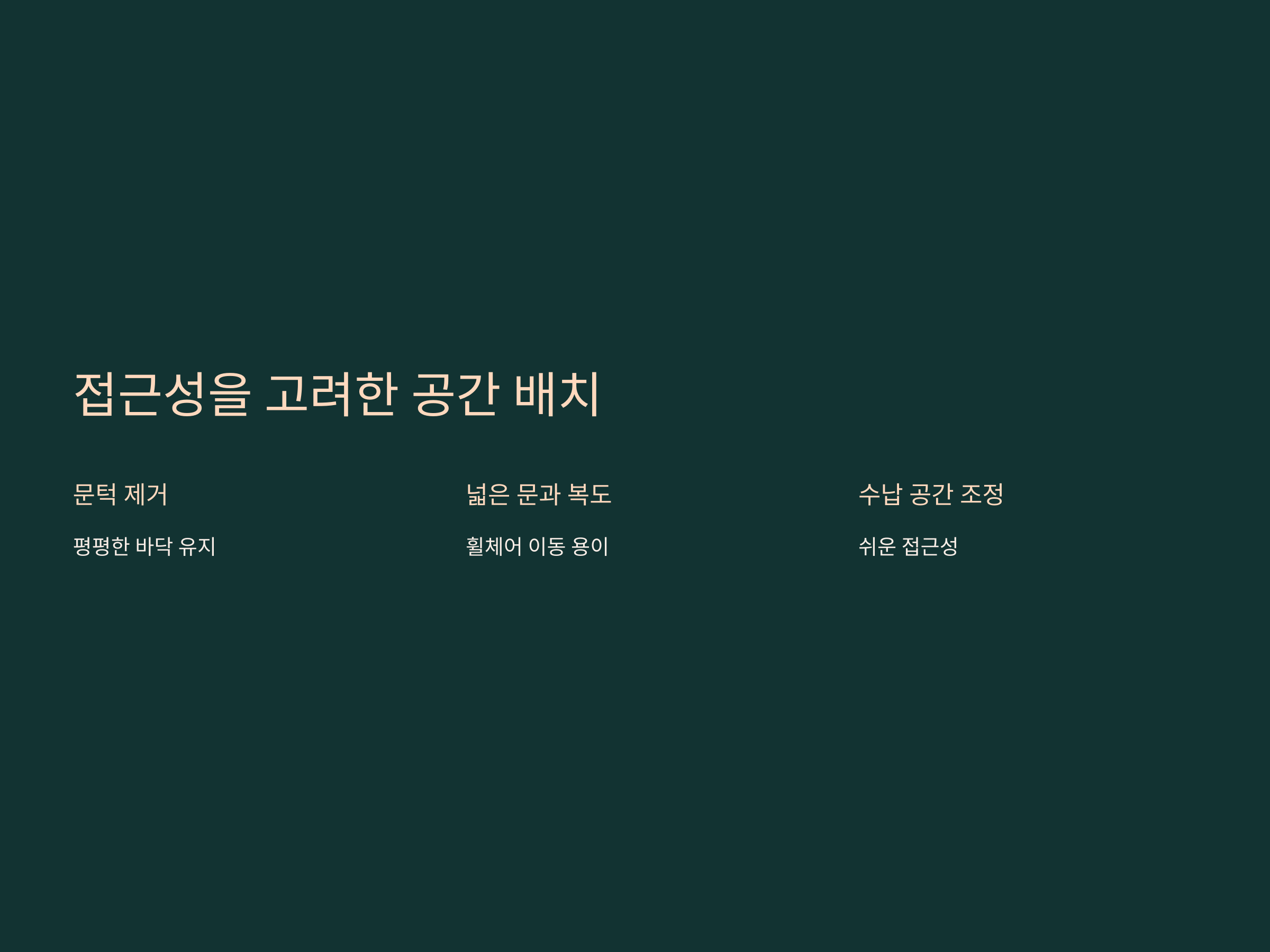 - 문턱 제거: 실내 공간의 문턱을 없애고 휠체어나 보행 보조기구 사용이 용이하도록 평평한 바닥을 유지합니다.