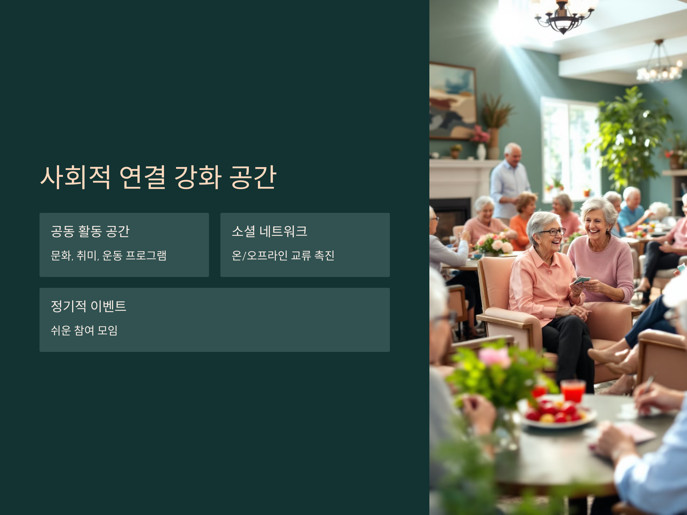 고령화 사회에서 사회적 고립은 큰 문제로 떠오르고 있습니다. 이를 해결하기 위한 커뮤니티 공간의 조성이 필수입니다.
