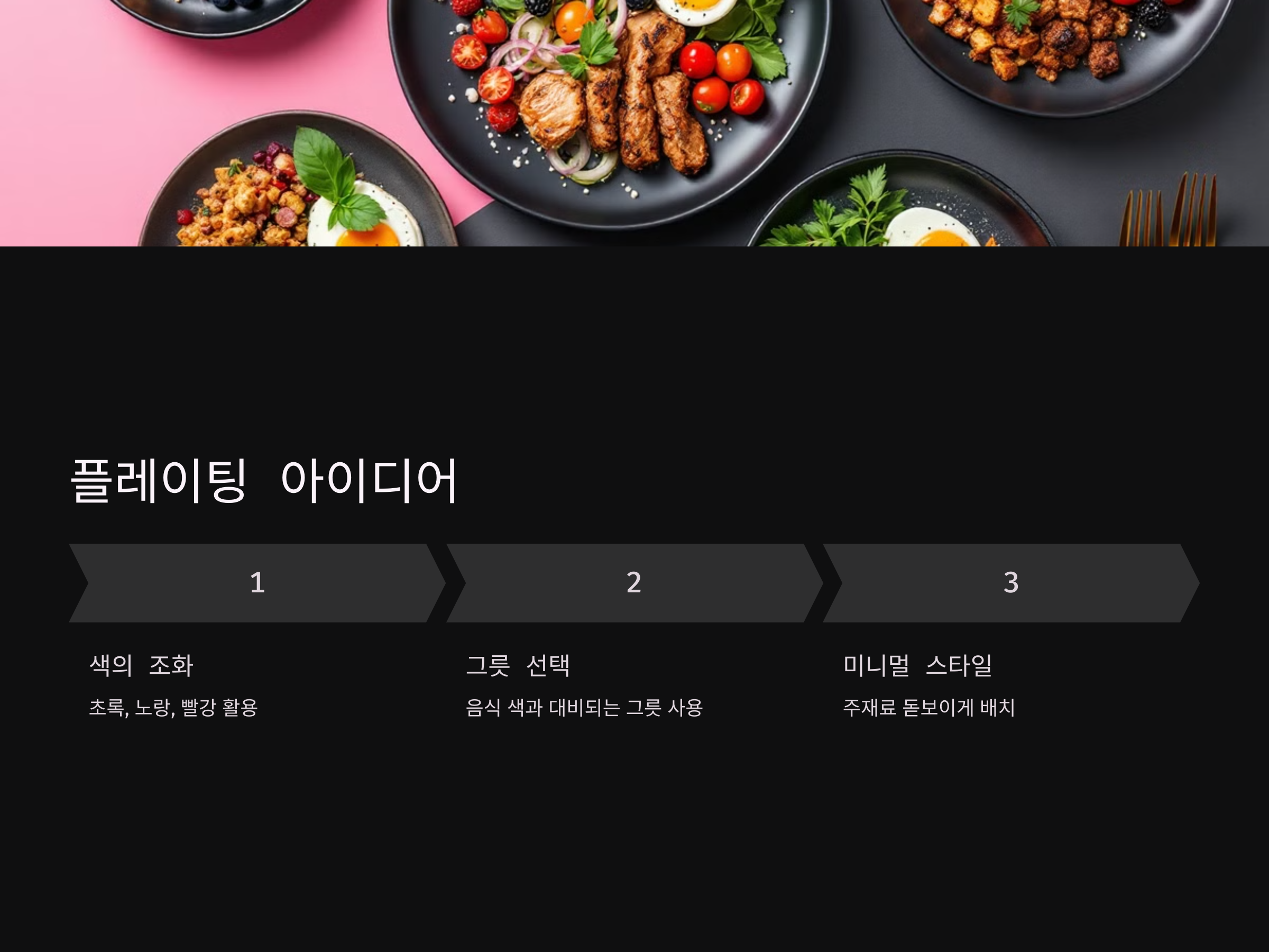 - 미니멀 스타일: 과도하게 장식하지 말고, 주재료가 돋보이도록 배치하세요.