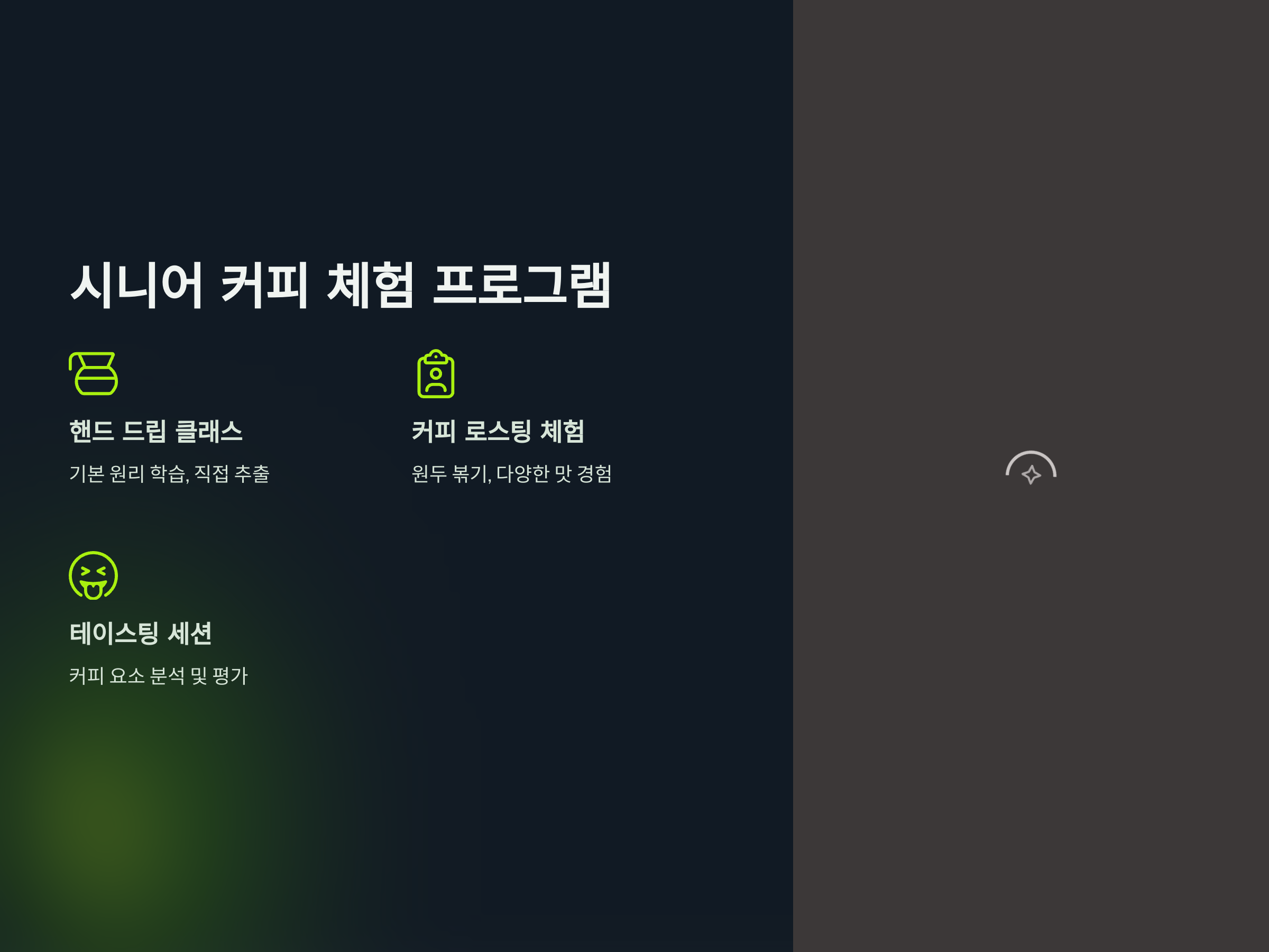 커피 문화는 끊임없이 진화하며, 시니어를 위한 맞춤형 프로그램도 꾸준히 확장되고 있습니다.