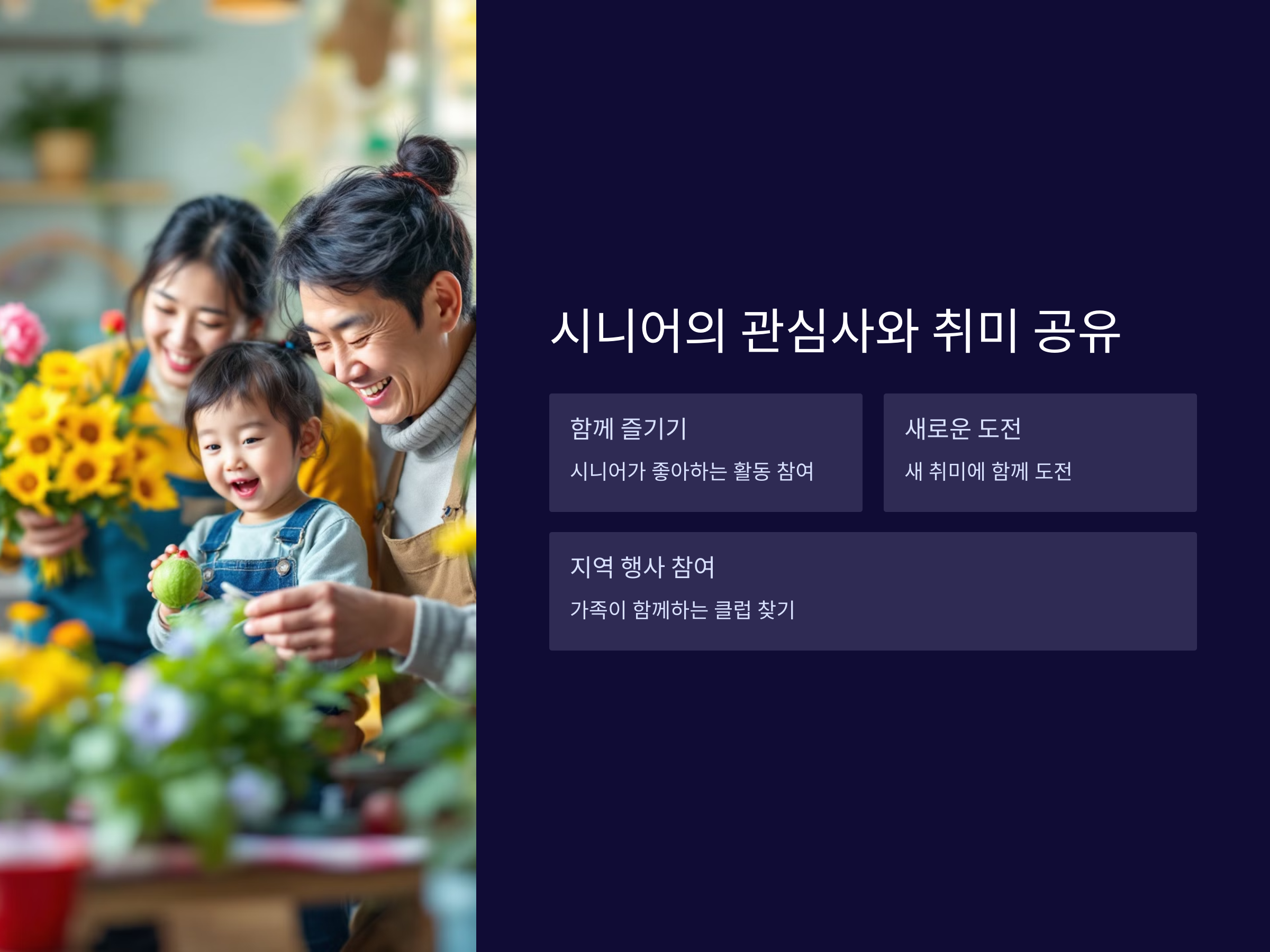 시니어의 취미나 관심사는 관계를 강화할 수 있는 좋은 출발점입니다.
