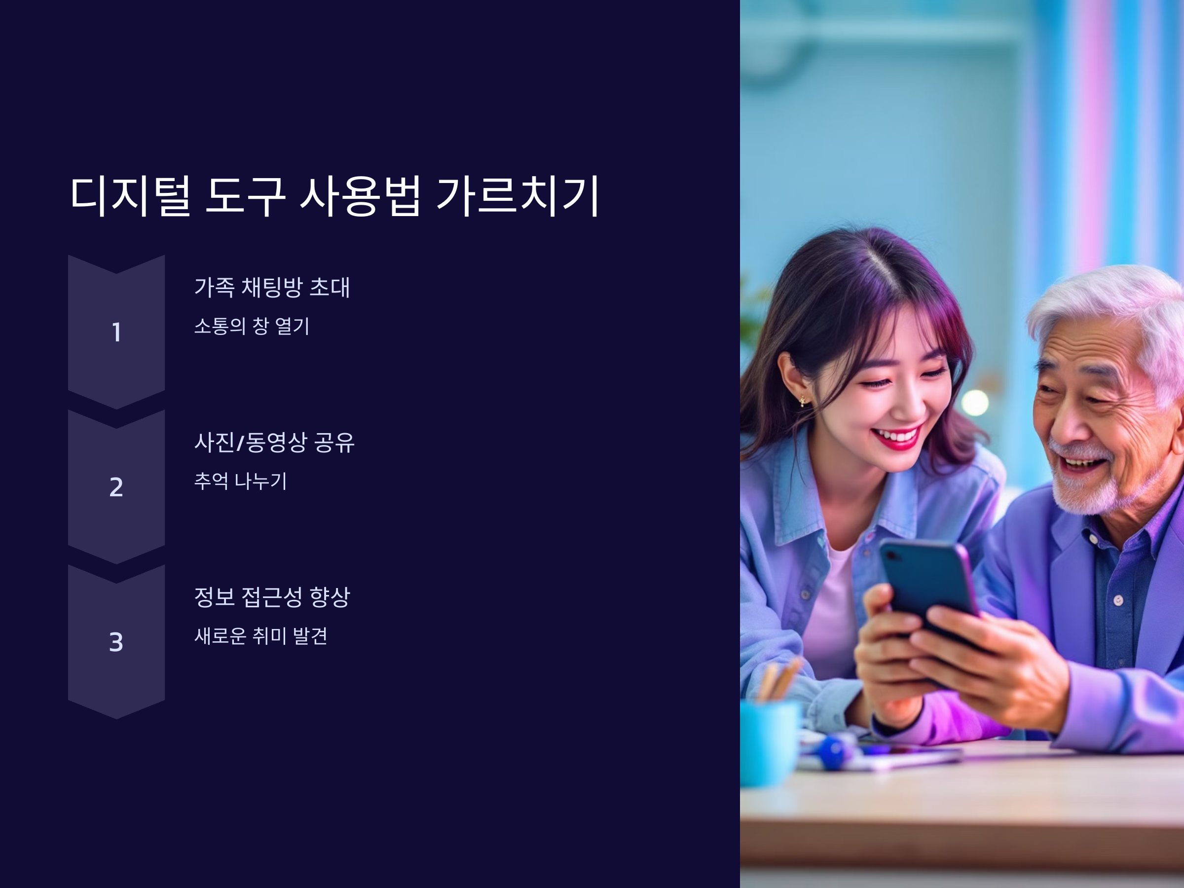 - 디지털 기기의 기본적인 사용법을 가르치고, 간단한 메시지나 화상통화로 소통을 시작하세요.