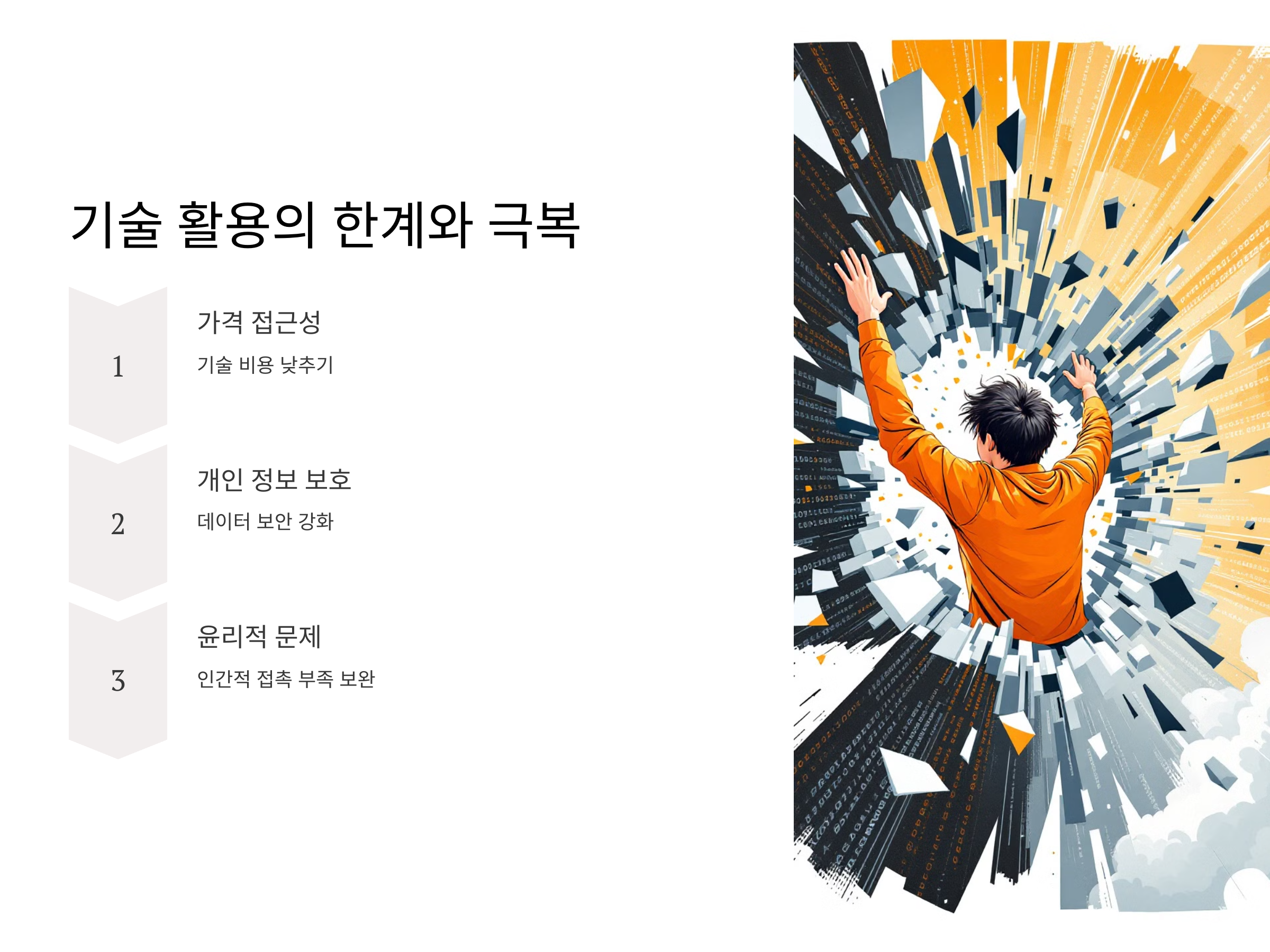 - 가격 접근성 문제: 기술 비용을 낮추어 보다 많은 사람들이 이용할 수 있어야 합니다.