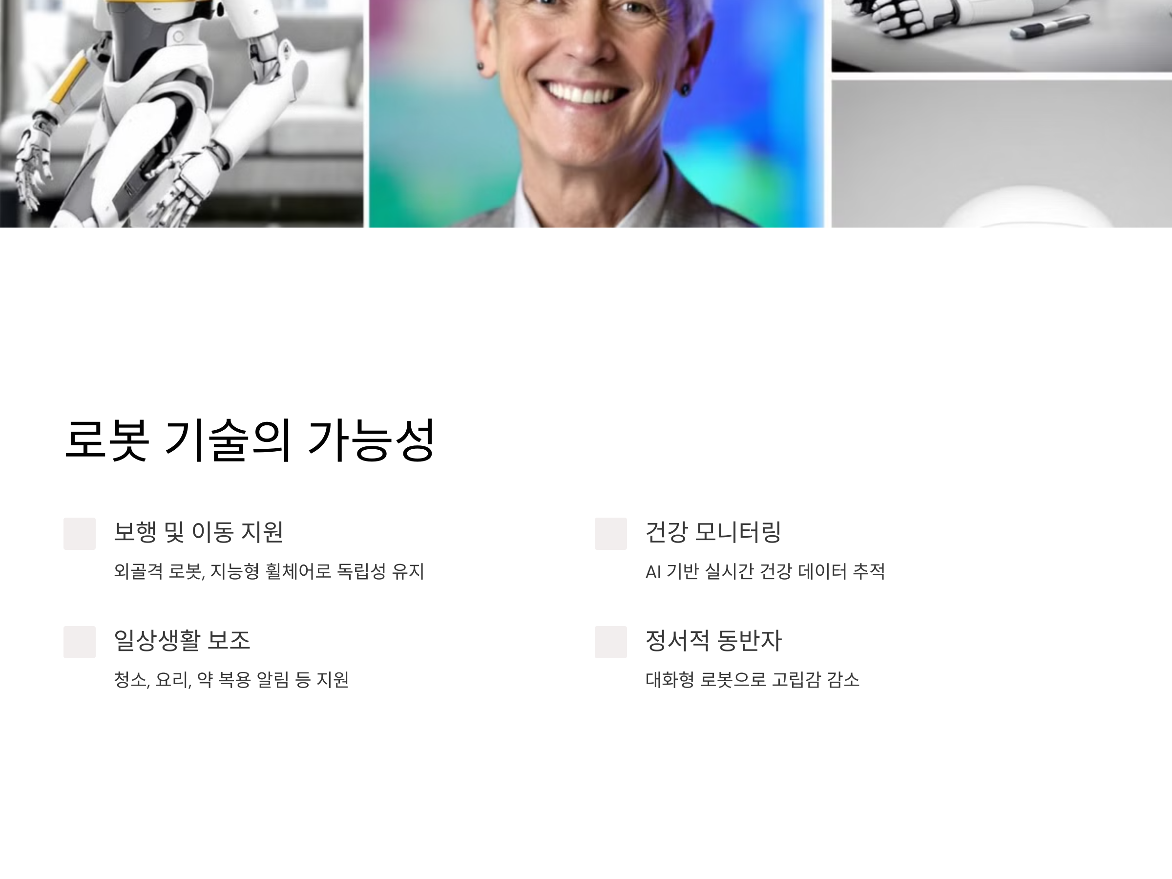 로봇 기술은 시니어 개인의 삶뿐 아니라 사회 전반에도 긍정적인 영향을 미칩니다.