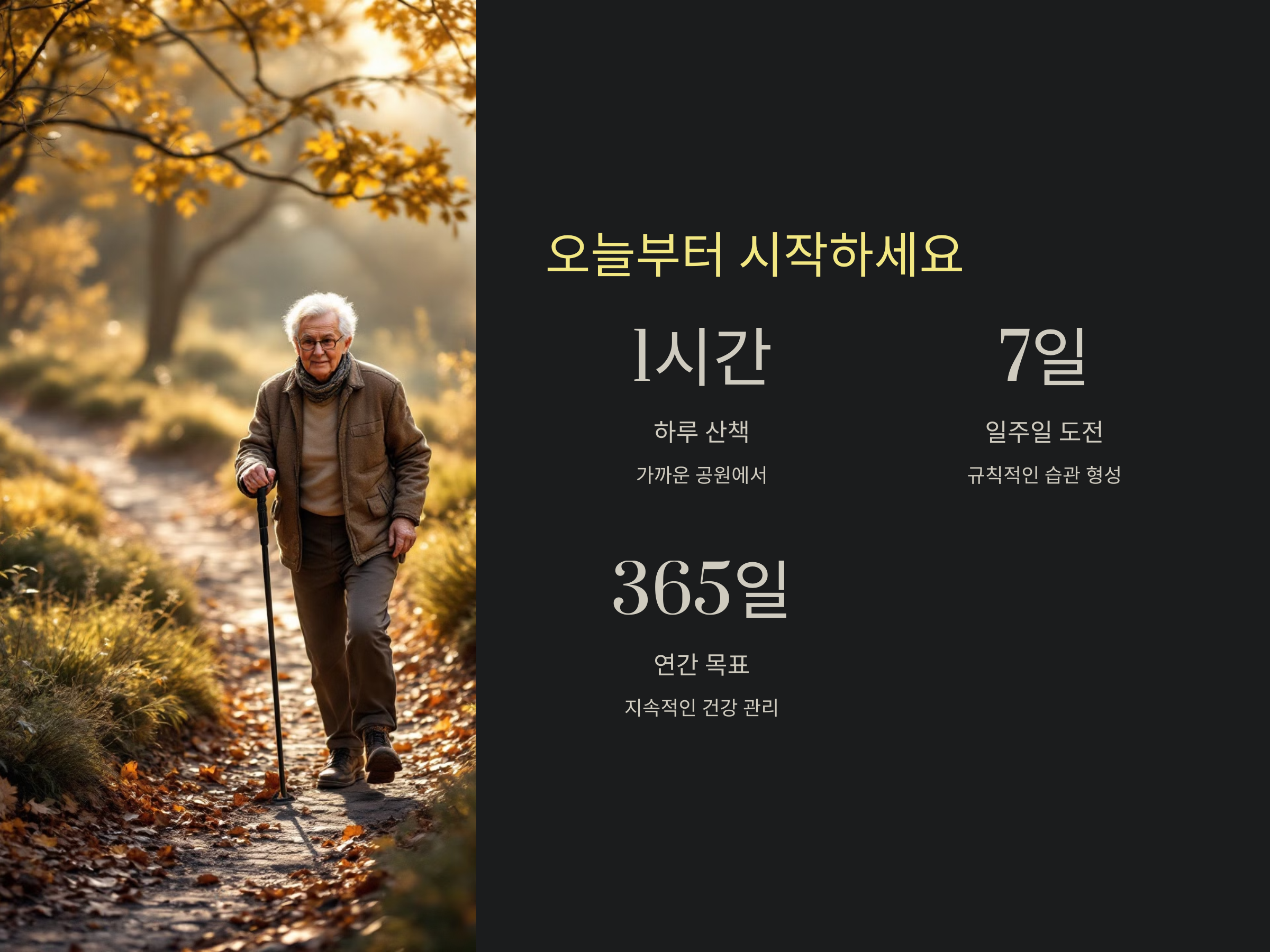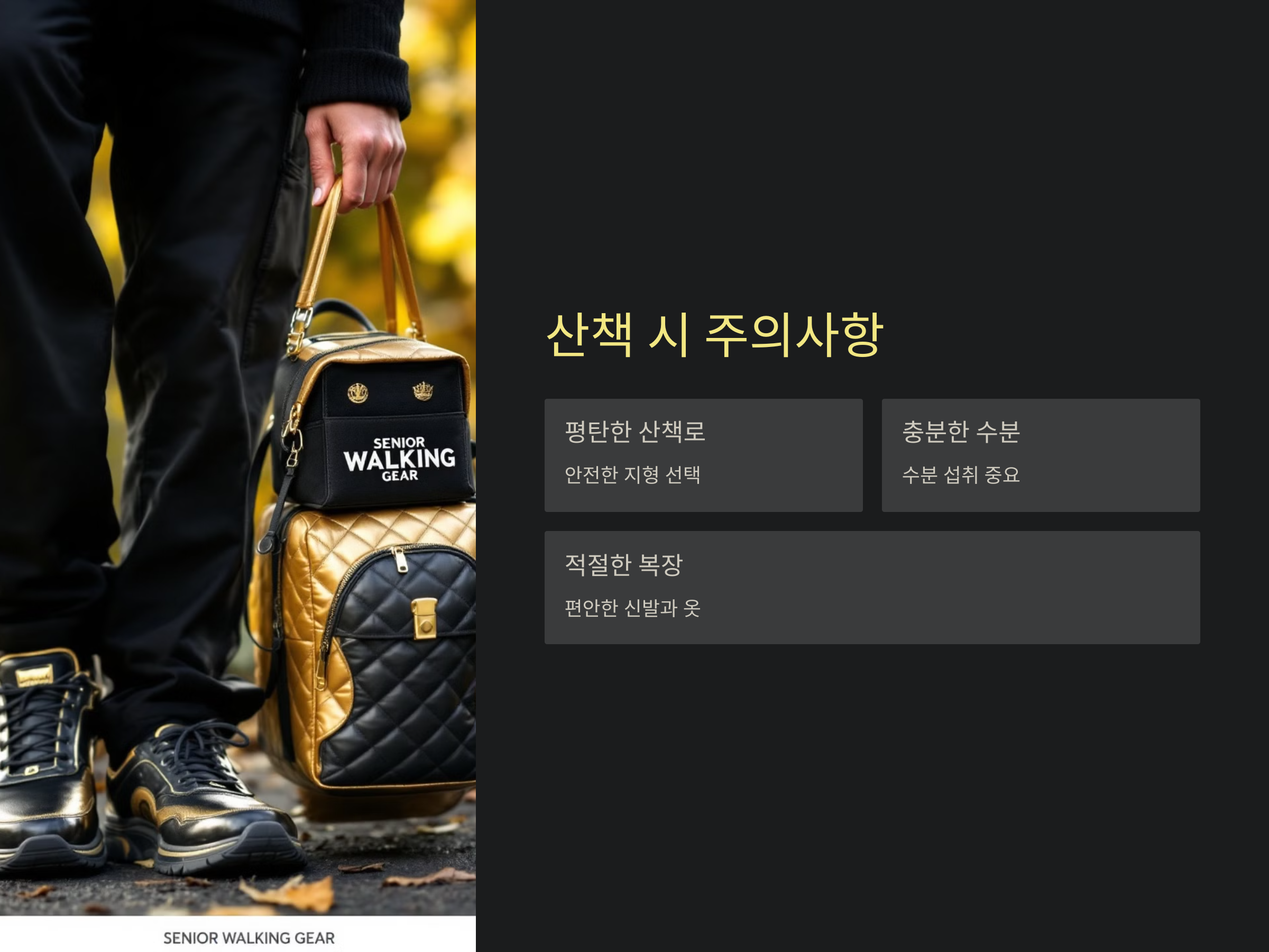 산책은 특별한 준비 없이도 누구나 실천할 수 있는 활동으로, 시니어들에게 큰 선물이 될 것입니다. 가까운 공원이나 산책로를 찾아 하루 한 시간이라도 자연 속에서 걸어보는 것을 추천합니다.