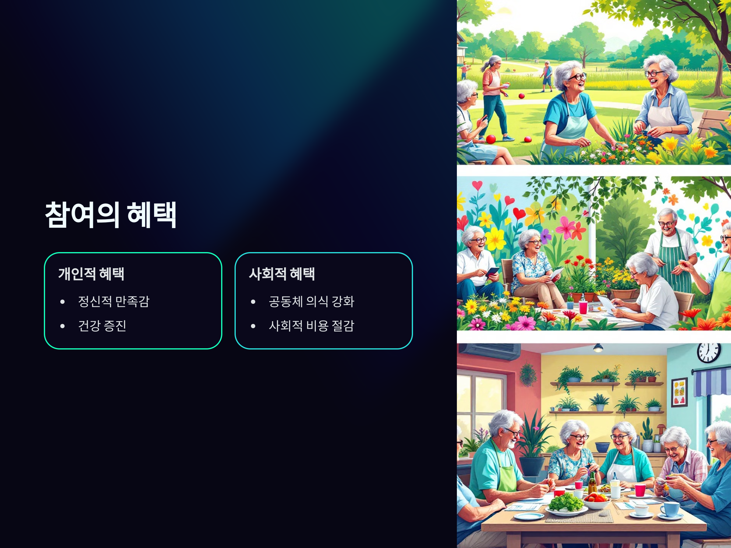 시니어들의 지역사회 참여는 개인과 사회 모두에게 이점을 제공합니다. 이는 단순한 봉사활동에 그치지 않고, 사회적 연대와 상호 지원을 통해 전체 지역사회의 안녕을 도모합니다.