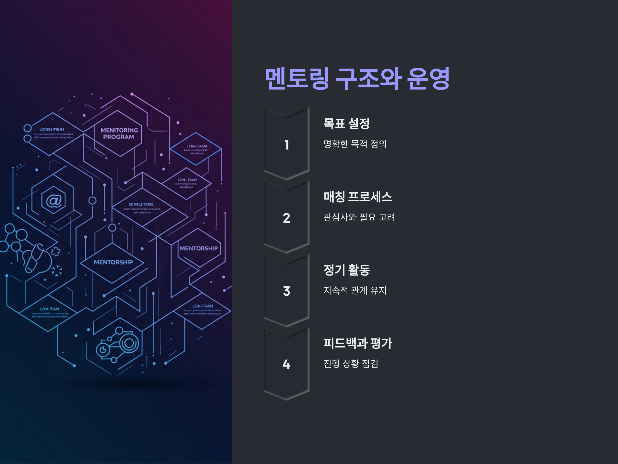 이러한 구조는 멘토링의 성과를 극대화하고, 멘토와 멘티 모두에게 긍정적인 경험을 제공합니다.