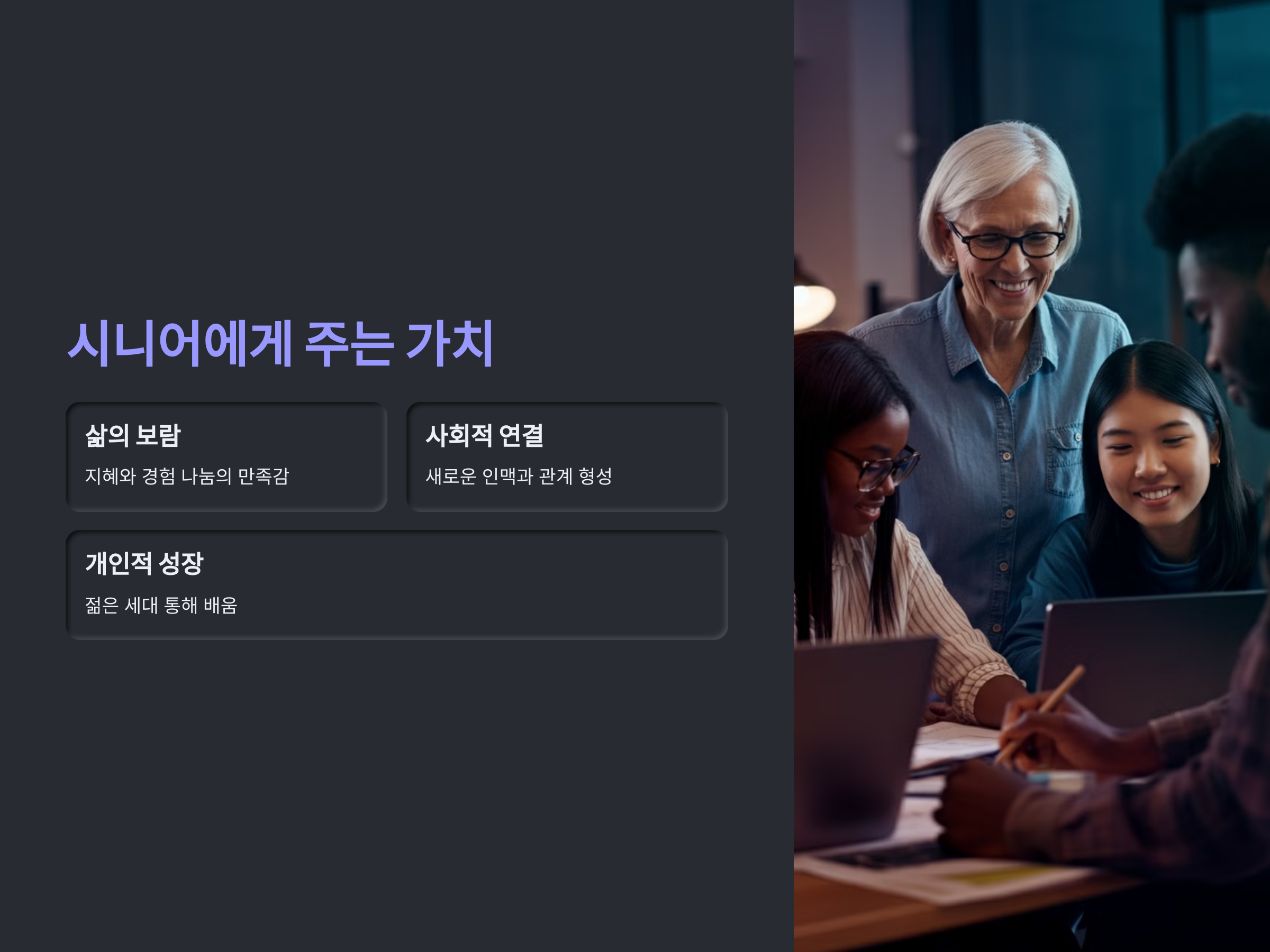 시니어는 멘토링을 통해 단순한 나눔 이상의 의미를 발견하게 됩니다. 그들에게 멘토링은 다음과 같은 가치를 제공합니다: