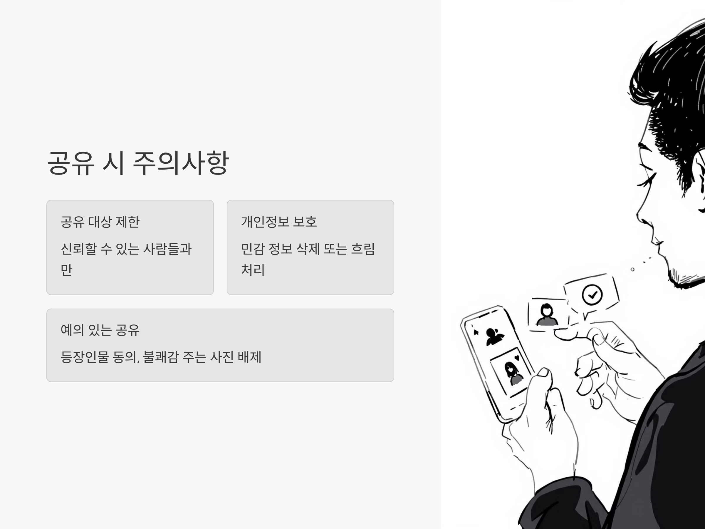 - 공유 대상 제한: 믿을 수 있는 사람들끼리만 사진을 공유하는 것이 중요합니다.