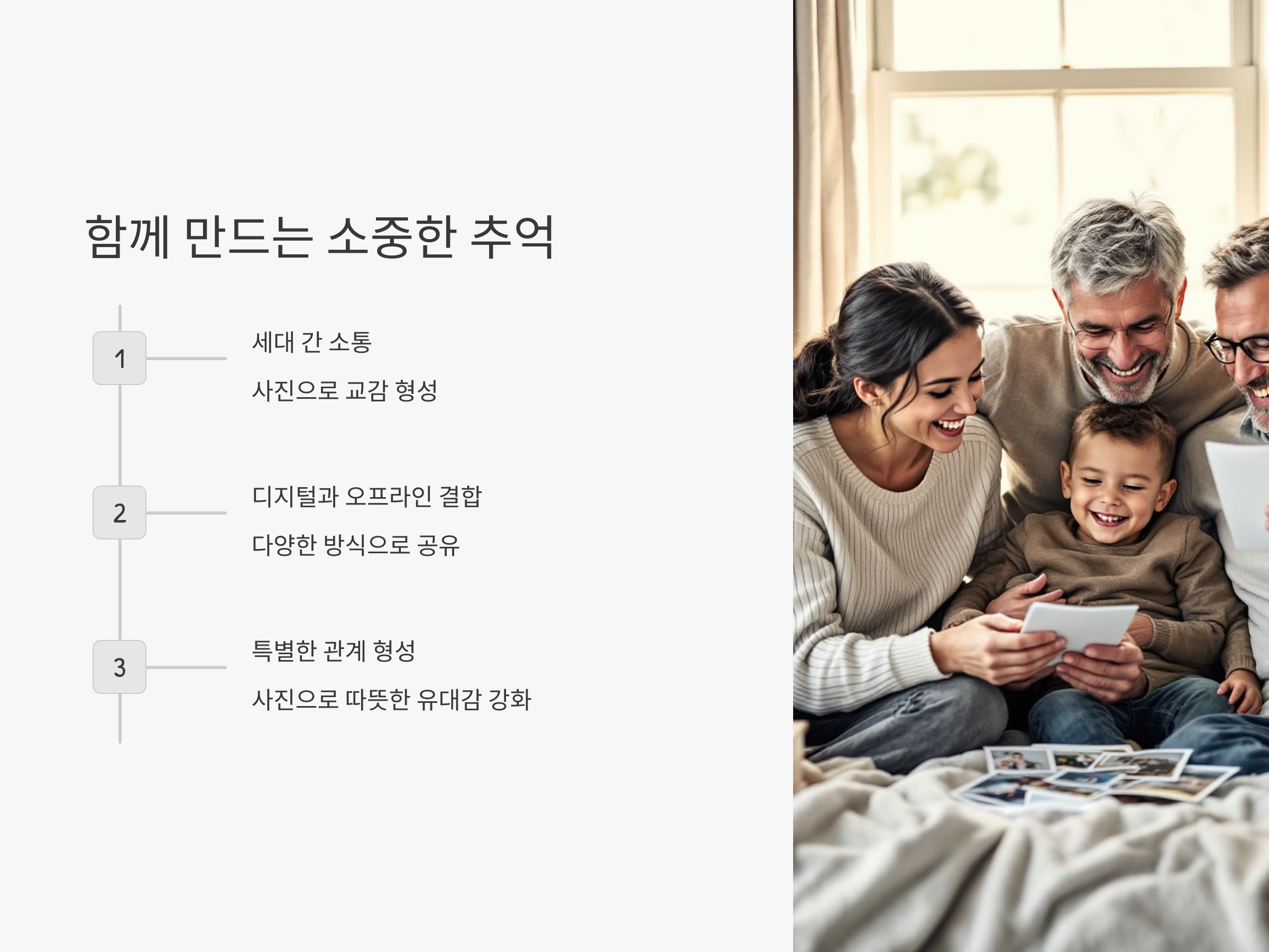 시니어 세대와 여행 사진을 공유하는 것은 단순히 이미지를 보여주는 행위를 넘어 세대 간 소통을 활성화하고, 따뜻한 추억을 함께 나누는 특별한 기회가 됩니다. 사진을 공유하며 대화의 주제를 확장하고, 기억을 되새기며 공감대를 형성할 수 있습니다. 특히 기술에 익숙하지 않은 시니어들에게 적절한 도구와 방법을 제공하면 그들의 여행 추억을 더욱 특별하게 만들어 줄 수 있습니다.