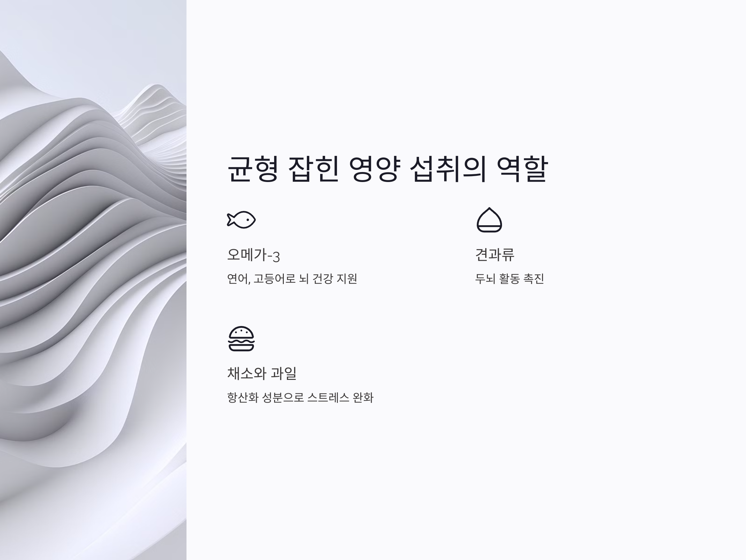 - 채소와 과일: 항산화 성분이 풍부하여 스트레스 완화에 도움을 줍니다.