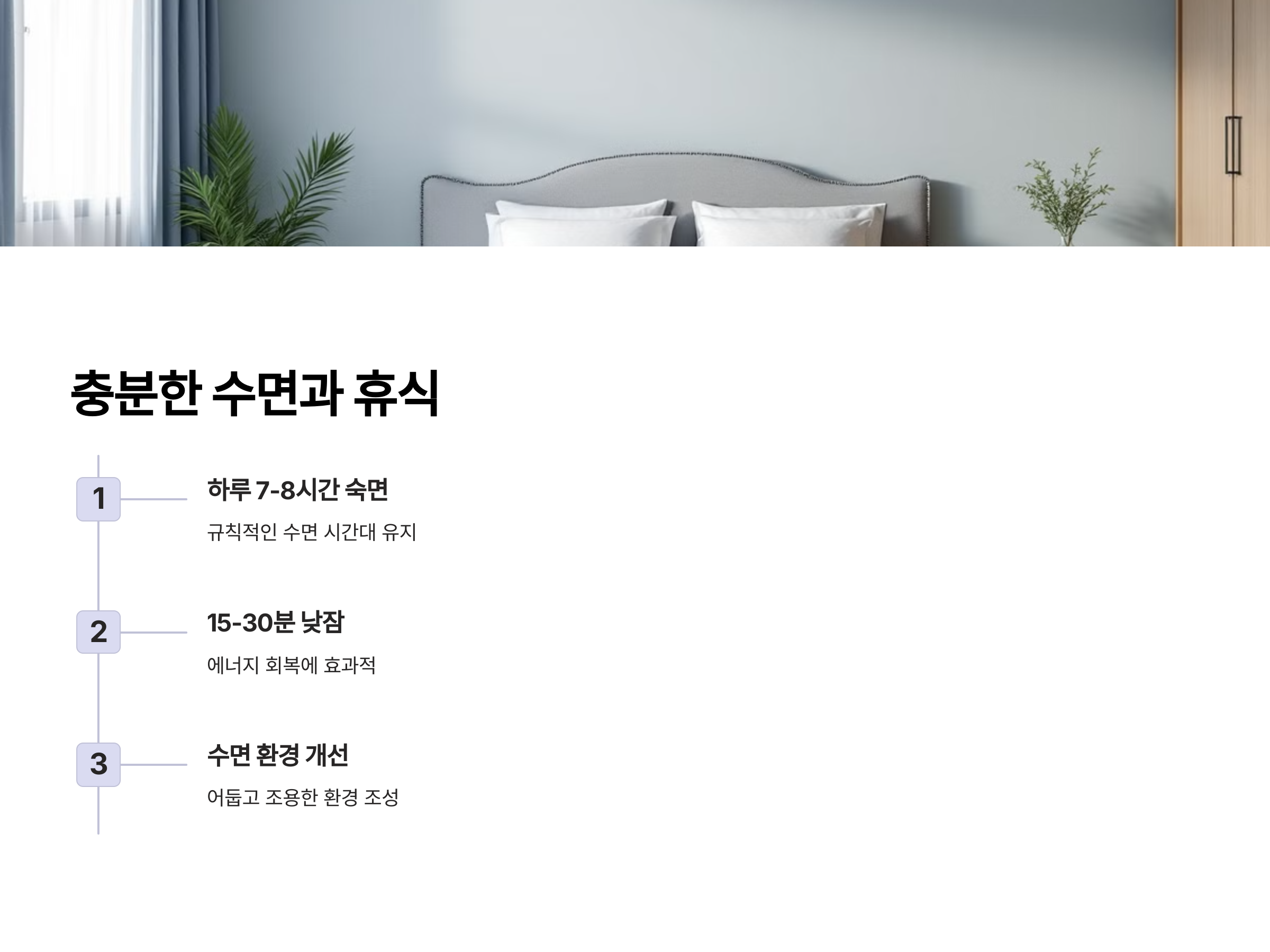 - 낮잠 활용: 15~30분의 낮잠은 에너지 회복에 효과적입니다.