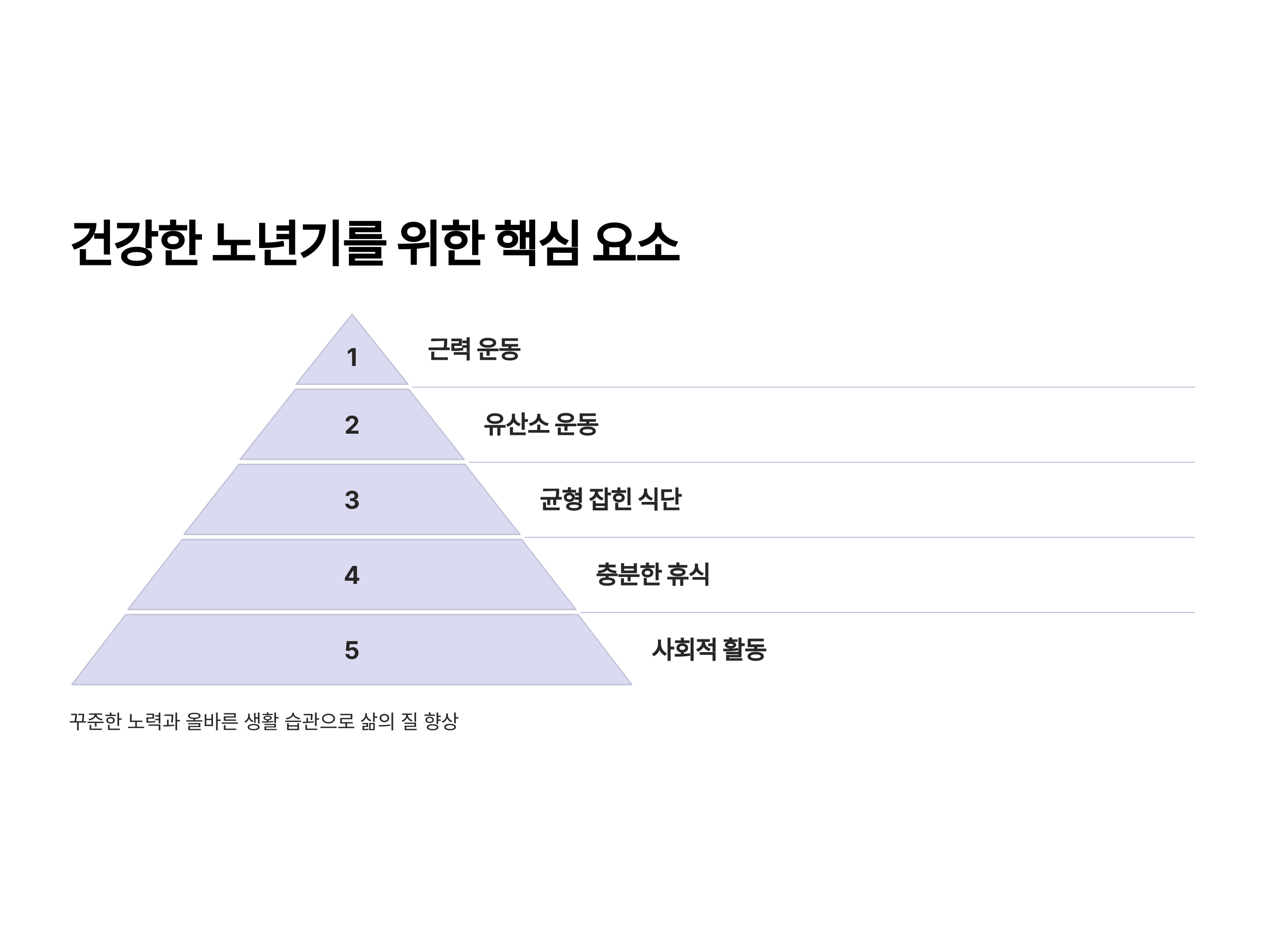 운동만큼 중요한 것이 바로 식단입니다. 나이가 들수록 소화 능력이 떨어지고, 필수 영양소가 부족해질 수 있기 때문에 균형 잡힌 식단을 유지해야 합니다.