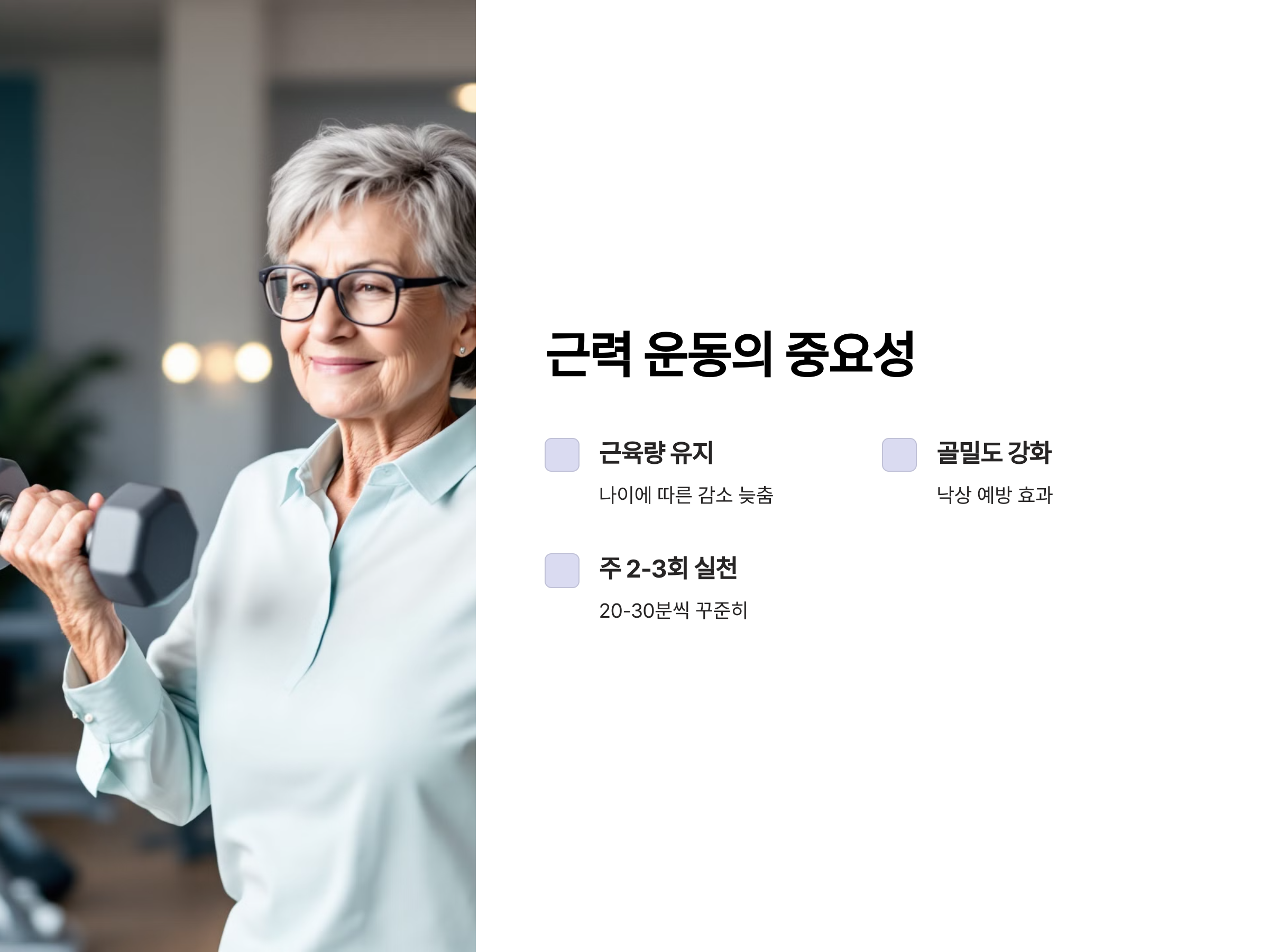 근력 운동은 시니어들의 체력 유지에 핵심적인 역할을 합니다. 나이가 들수록 근육량이 감소하는 것은 자연스러운 현상이지만, 꾸준한 근력 운동을 통해 이를 늦추고 신체 균형을 유지할 수 있습니다. 특히, 근력 운동은 골밀도 강화와 낙상 예방에도 탁월한 효과를 발휘합니다.