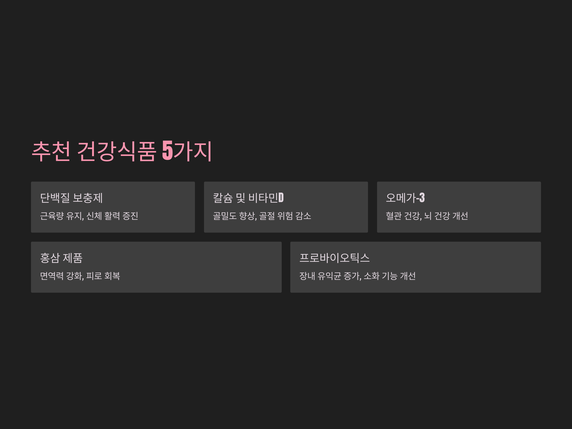 - 단백질 보충제: 근육량 감소를 예방하고 신체 활력을 유지해 줍니다.