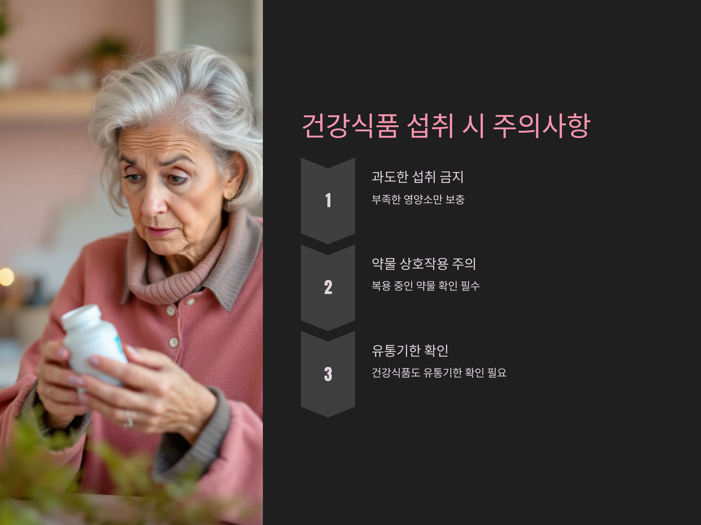 - 과도한 섭취 금지: 영양 보충제는 부족한 부분만 보충해야 합니다.