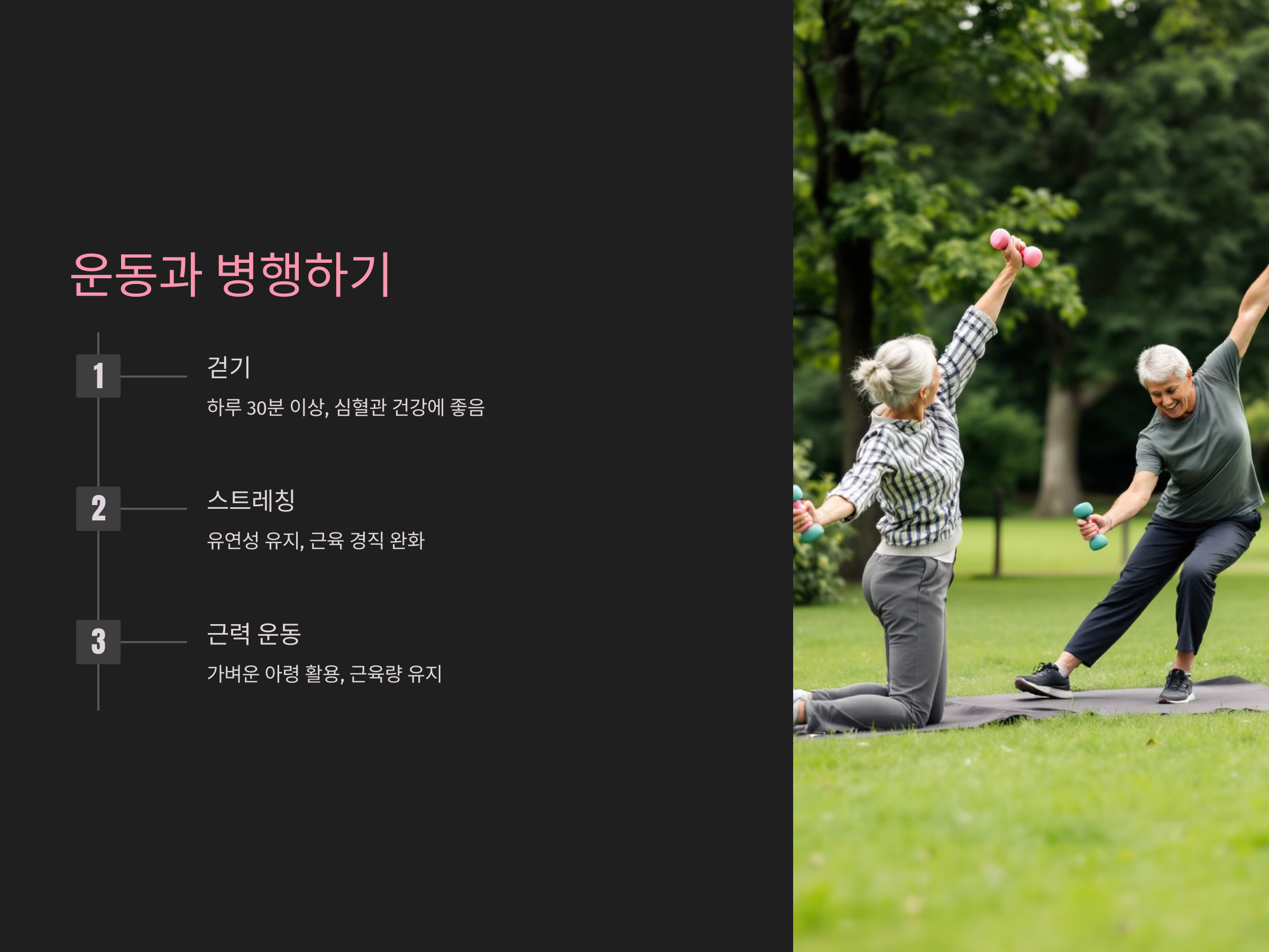 - 스트레칭: 유연성을 유지하고 근육 경직을 완화합니다.