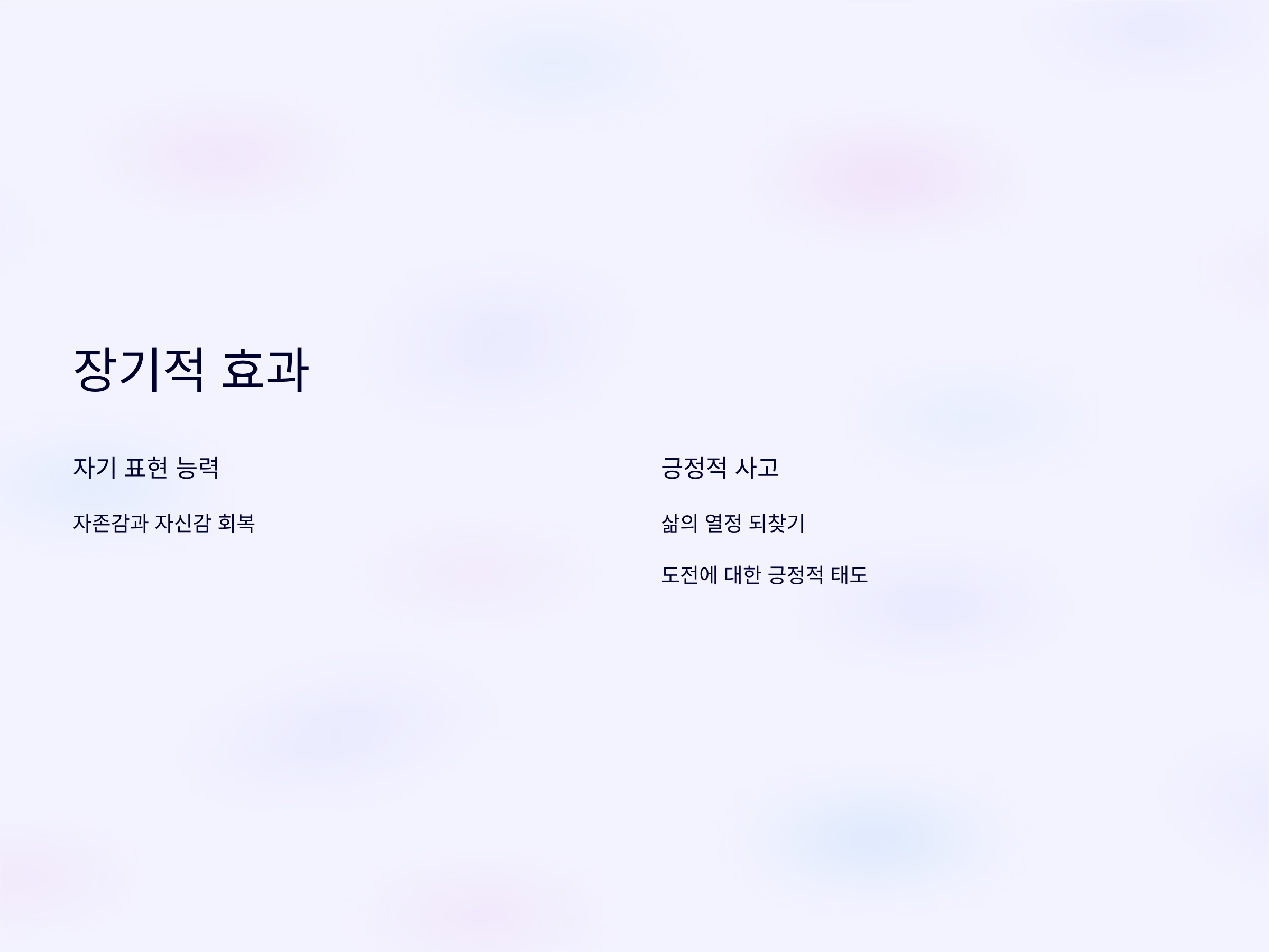 - 실패에 대한 두려움을 극복하고 도전에 대한 긍정적인 태도를 갖게 됩니다.