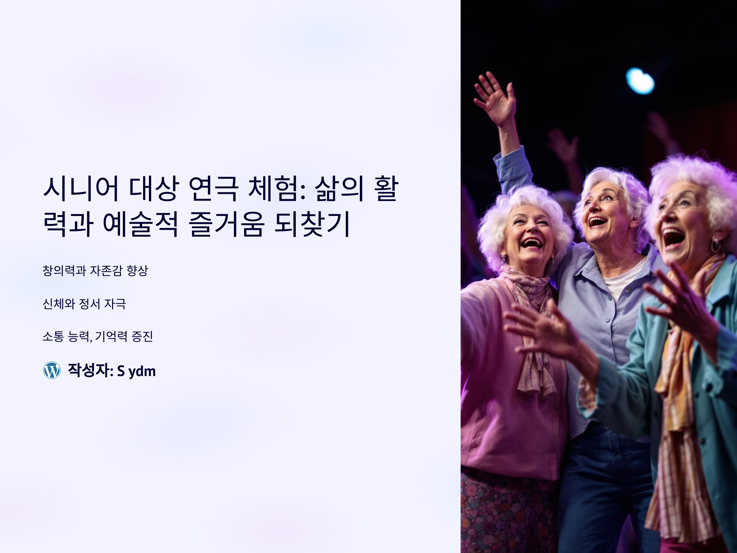 연극 체험은 시니어들에게 창의력과 자존감을 높이고, 신체와 정서를 모두 자극하는 매력적인 활동으로 주목받고 있습니다. 특히 연극은 단순한 취미를 넘어 소통 능력 향상, 기억력 증진, 사회적 관계 확대 등의 긍정적인 영향을 미치며 새로운 삶의 동기를 제공합니다. 시니어 세대가 참여할 수 있는 연극 프로그램의 장점과 활용법을 자세히 알아보겠습니다.