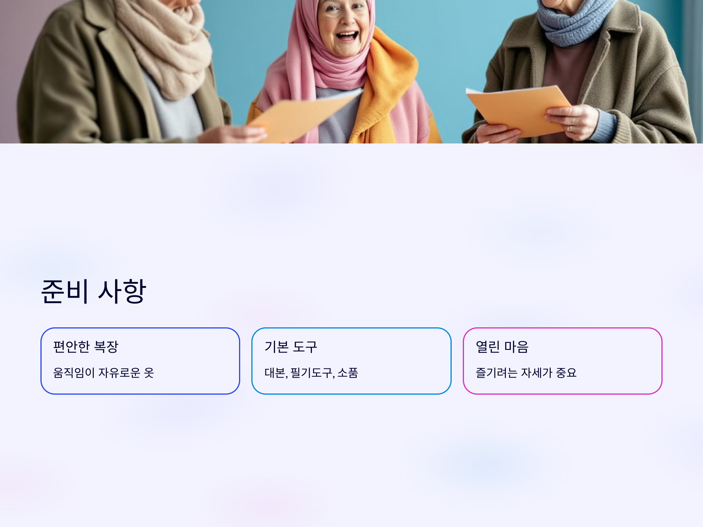 - 초보자에게는 간단한 대본과 필기 도구, 연습용 소품 정도로 충분합니다.