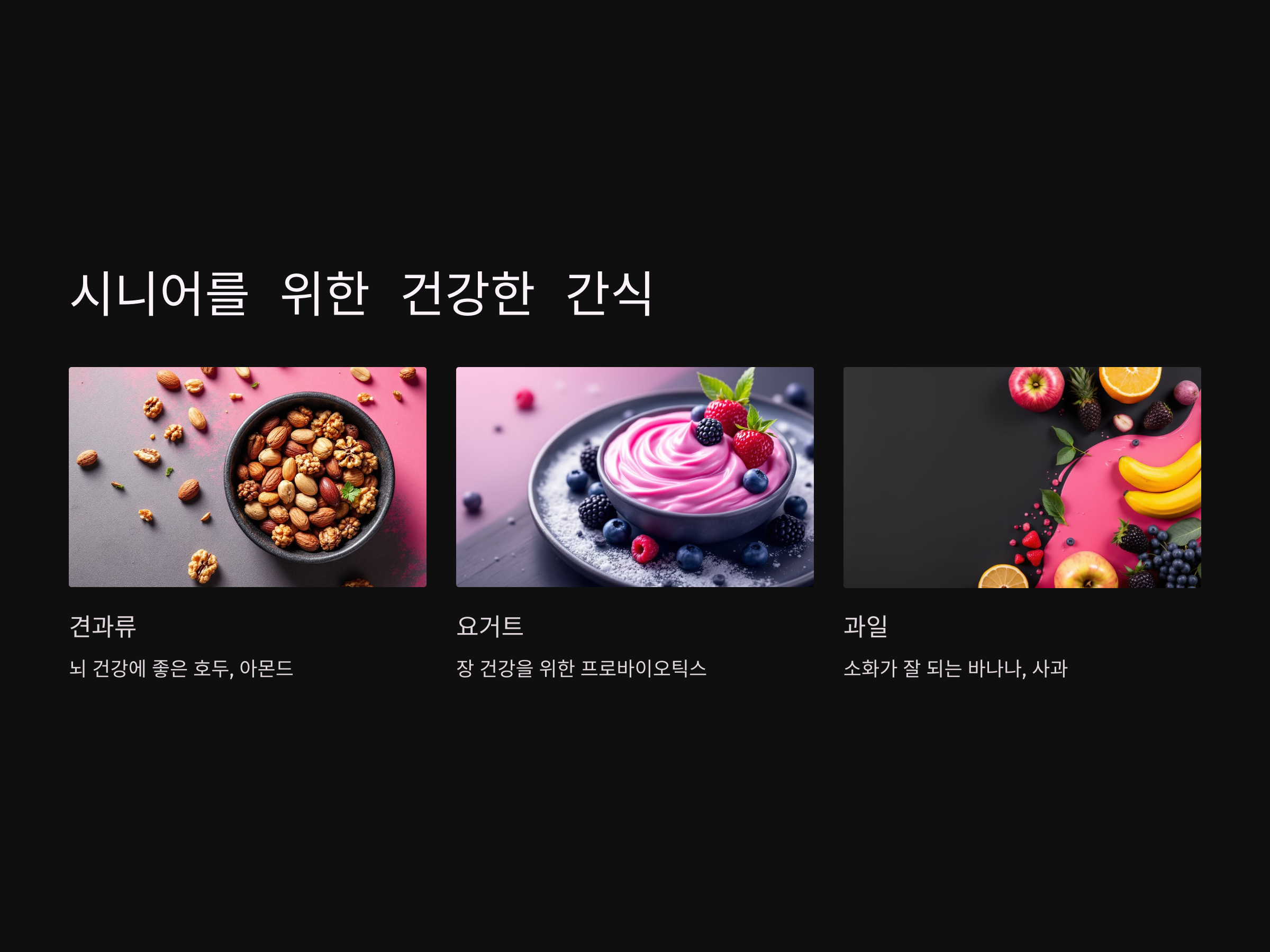 이와 같은 식단은 시니어의 소화에 부담을 주지 않으면서도 영양 균형을 유지하는 데 초점을 맞추고 있습니다. 하루 세 끼 외에도 적절한 간식으로 견과류, 바나나, 요거트 등을 섭취하면 더욱 좋습니다.