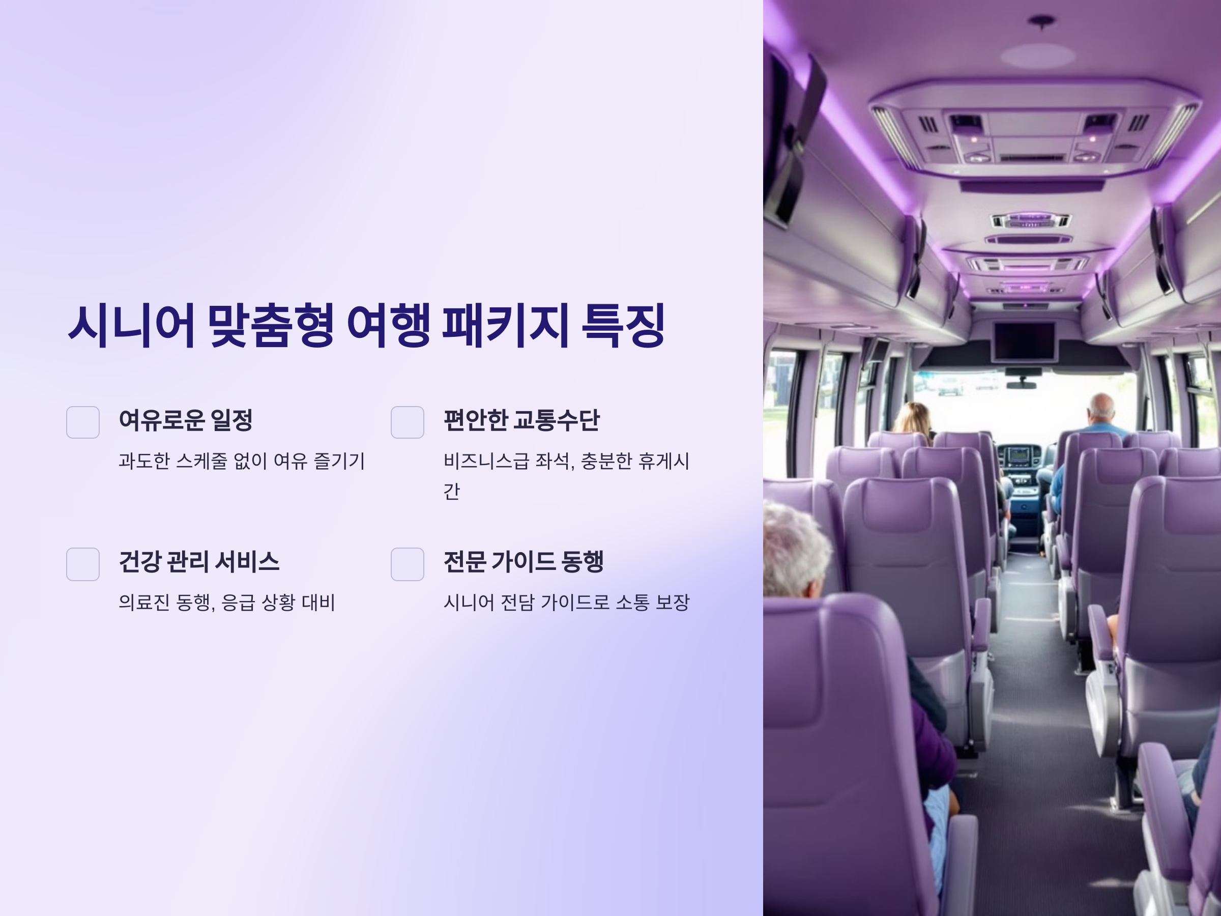- 전문 가이드 동행: 시니어 전담 가이드로 언어 및 일정 소통 보장