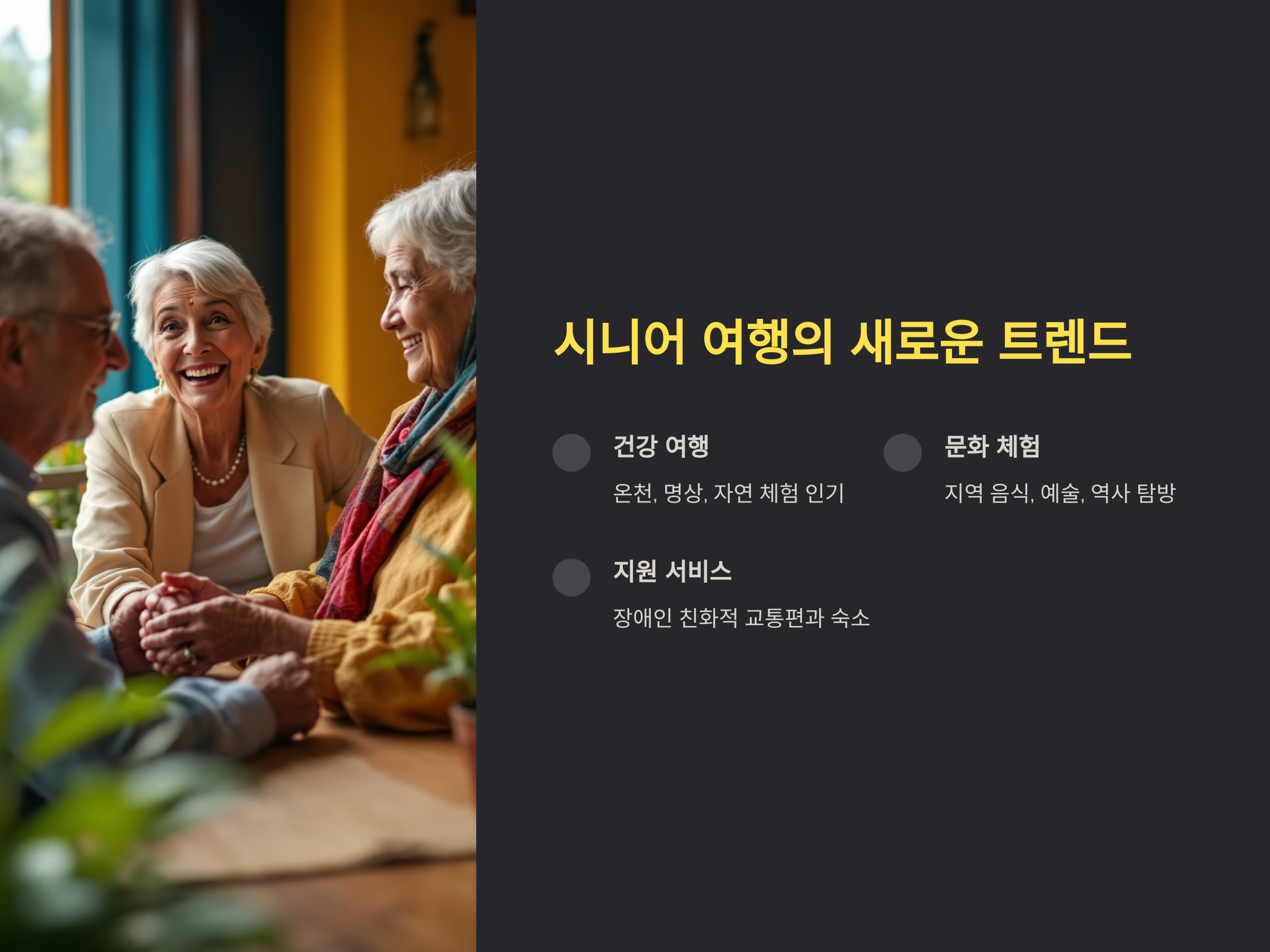 이러한 트렌드는 여행의 접근성을 높이고, 시니어들이 더욱 안전하고 즐겁게 여행을 즐길 수 있도록 돕습니다.