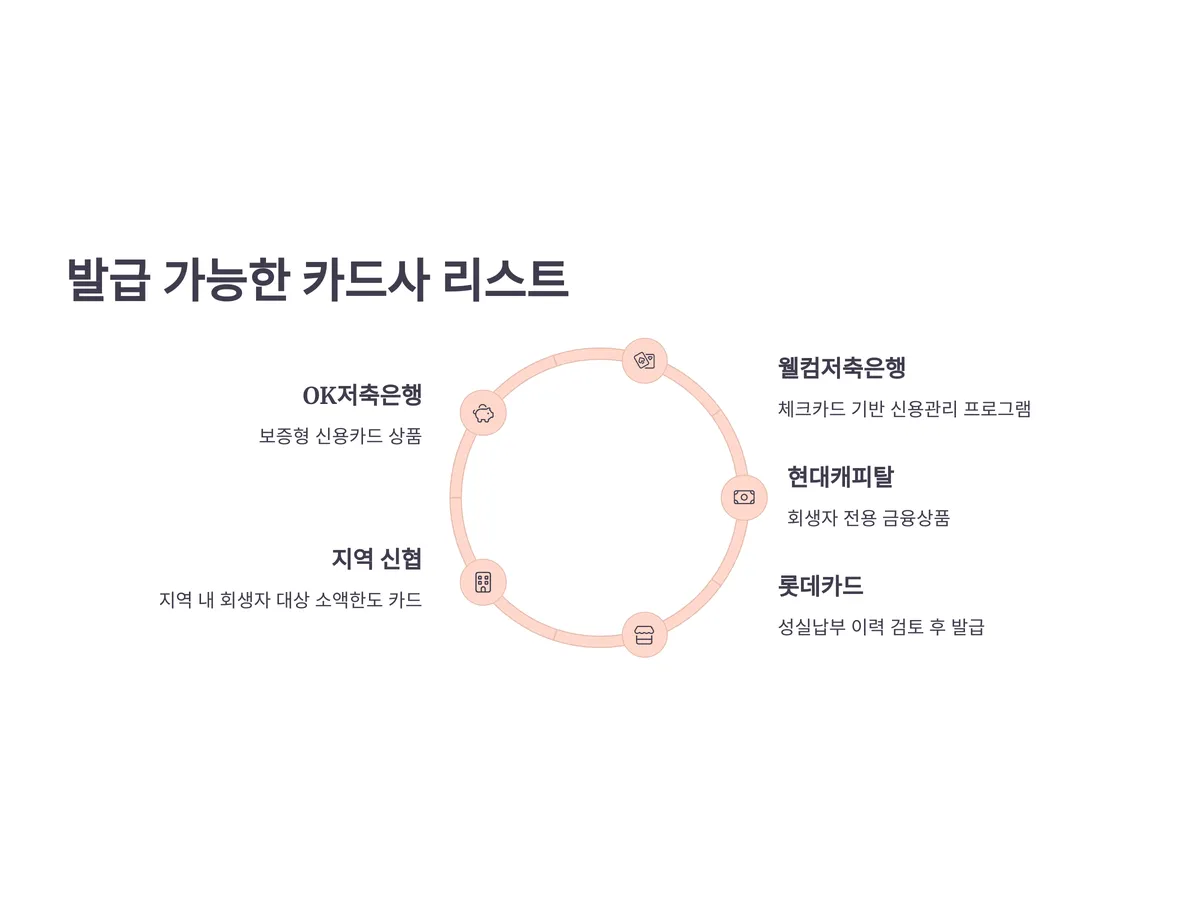 현재 개인회생자에게도 발급 가능한 신용카드를 운영하는 기관은 많지 않지만, 다음과 같은 곳에서 제한적으로 가능성을 열어두고 있습니다.