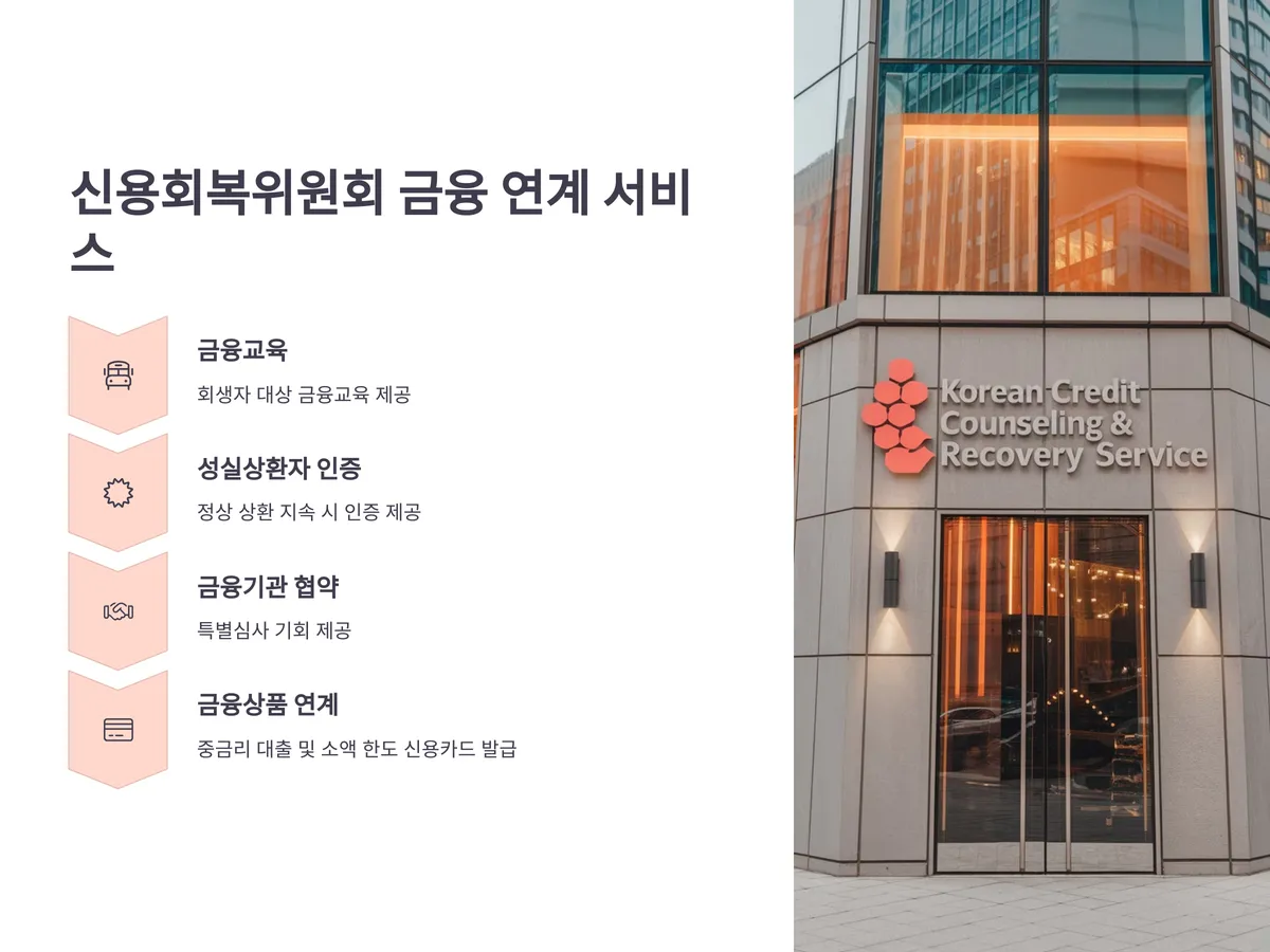 신용회복위원회에서는 회생자에게 금융교육과 함께 제도권 금융상품 연계를 도와주는 서비스를 운영 중입니다. 특히 '성실상환자 인증' 제도를 통해 일정 기간 동안 정상 상환을 지속한 회생자는 일부 금융기관과의 협약을 통해 특별심사를 받을 수 있습니다. 이로 인해 발급 가능한 상품군에 접근이 가능해지며, 특히 중금리 대출 및 소액 한도 신용카드 발급 기회를 얻을 수 있습니다.