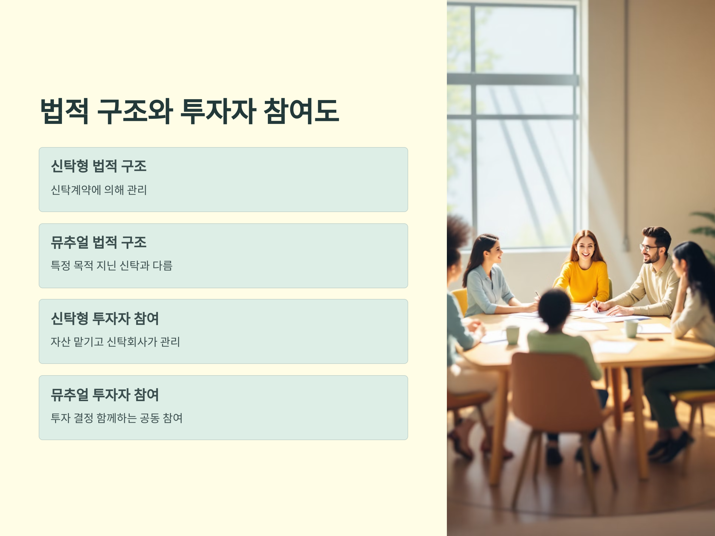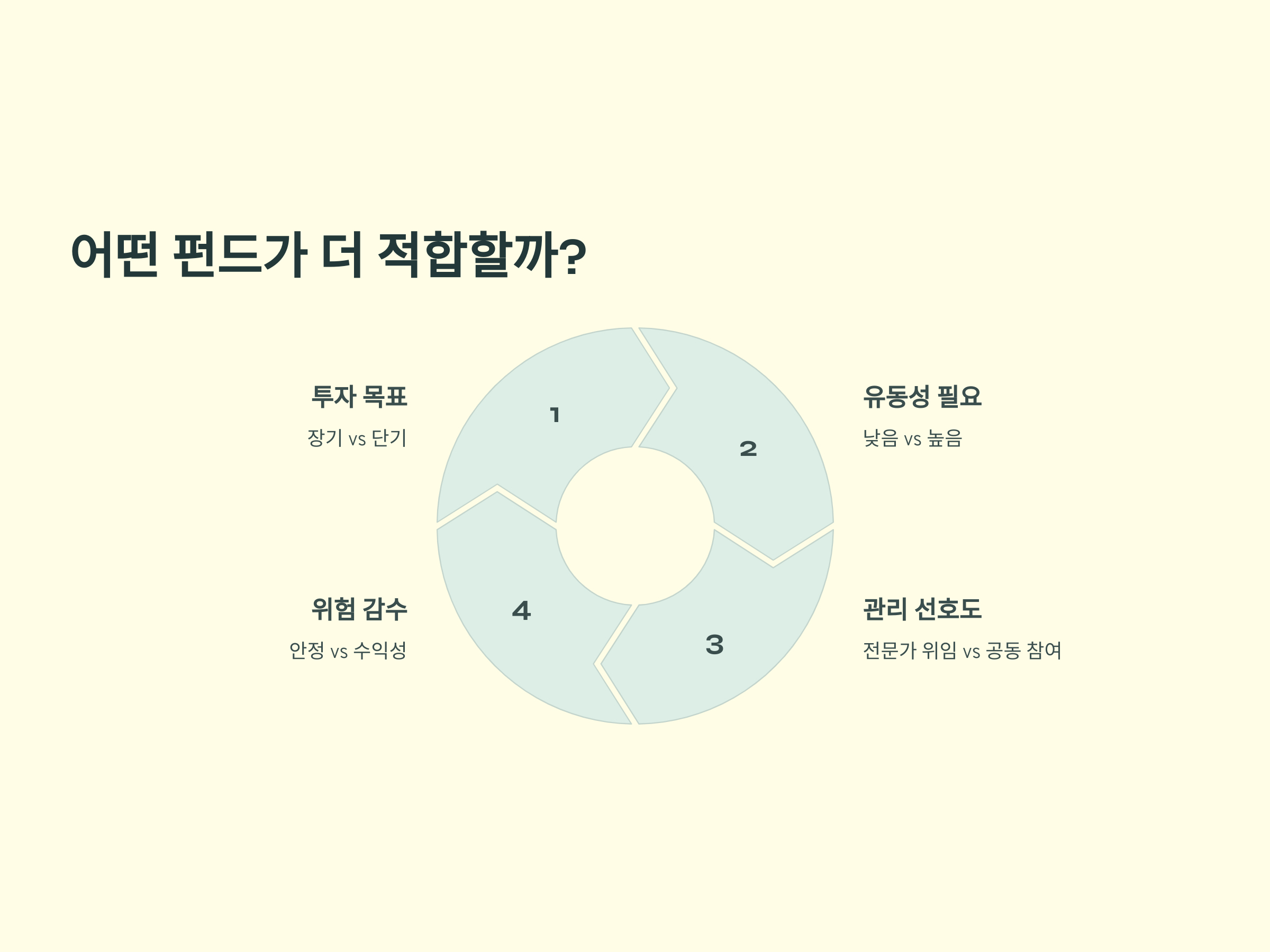 - 단점: 특정 목적에 맞는 자산 운용이 어려울 수 있으며, 투자자들에게 책임이 분담되는 만큼 위험도 큽니다.